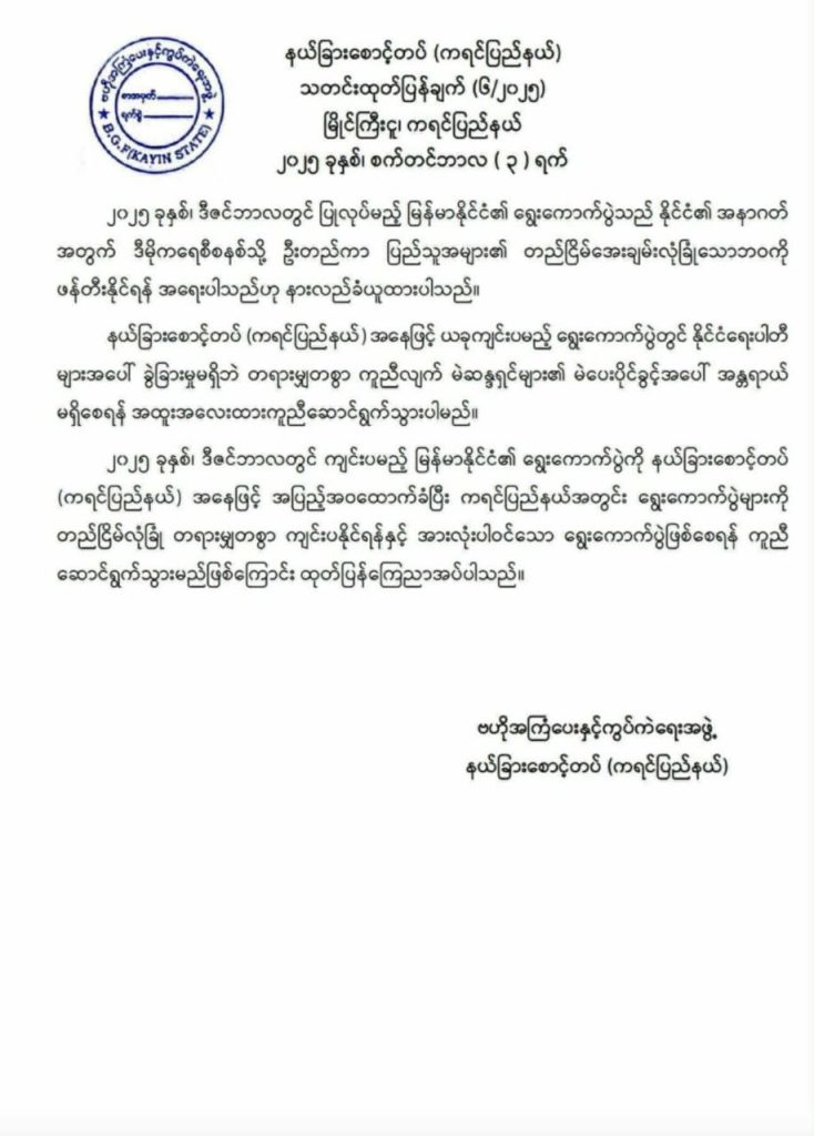 လာမည့်ရွေးကောက်ပွဲသည် ပြည်သူအများ၏ တည်ငြိမ်အေးချမ်းလုံခြုံသောဘဝကို ဖန်တီးနိုင်ရန် အရေးပါသည်ဟု နားလည်ခံယူထားသဖြင့် ရွေးကောက်ပွဲကို အပြည့်အဝထောက်ခံပြီး အားလုံးပါဝင်သော ရွေးကောက်ပွဲဖြစ်စေရန် ကူညီသွားမည်ဟု BGF (နယ်ခြားစောင့်တပ် (ကရင်ပြည်နယ်)) က ထုတ်ပြန်ထားသည်။