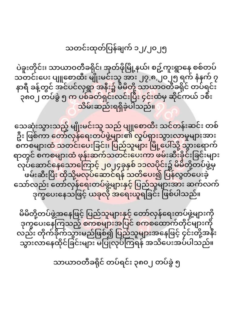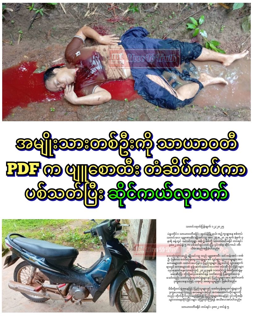 အမျိုးသားတစ်ဦးကို သာယာဝတီ PDF က ပျူစောထီး တံဆိပ်ကပ်ကာ ပစ်သတ်ပြီးနောက် ဆိုင်ကယ်လုယက်လိုက်သည်ဟု ကျူးလွန်သည့် သာယာဝတီခရိုင် တပ်ရင်း ၃၈၀၂ တပ်ခွဲ ၅ က ယနေ့ ဝန်ခံထားသည်။
