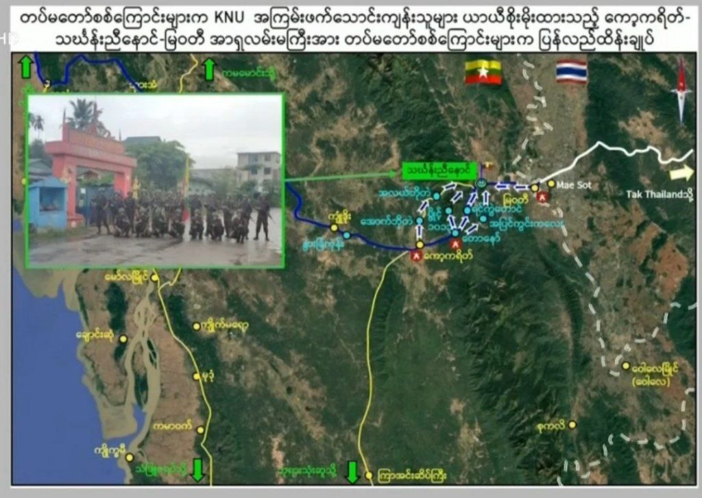 တပ်မတော်စစ်ကြောင်းများက KNU နှင့် PDF များကို တိုက်ထုတ်ပြီး ထိုင်းနိုင်ငံနှင့် မြန်မာနိုင်ငံတို့၏ အဓိကကုန်စည်စီးဆင်းရာ လမ်းမကြီးပေါ် တွင်ရှိသည့် ကော့ကရိတ်- သင်္ဃန်းညီနောင်-မြဝတီ အာရှလမ်းမကြီး တစ်လျှောက်အား ပြန်လည်ထိန်းချုပ်နိုင်ခဲ့သည်ဟု ယခုည အတည်ပြုကြေညာသည်။