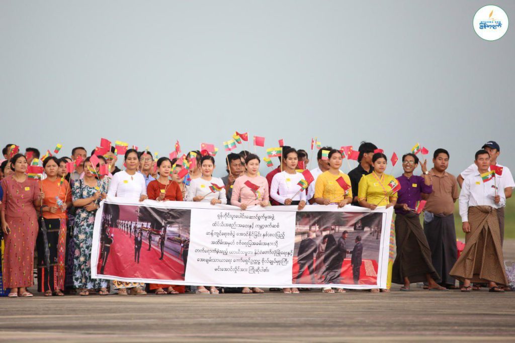 ထို့ပြင် “တရုတ် – မြန်မာ ချစ်ကြည်ရေး အဓွန့်ရှည်ပါစေ”၊ “အမျိုး၊ ဘာသာ၊ သာသနာအတွက် ကြိုးပမ်းဆောင်ရွက်နေသည့် ဗိုလ်ချုပ်မှူးကြီး မင်းအောင်လှိုင် ကျန်းမာပါစေ” ၊ “ယာယီသမ္မတ နိုင်ငံတော်လုံခြုံရေးနှင့်အေးချမ်းသာယာရေးကော်မရှင်ဥက္ကဋ္ဌ ဗိုလ်ချုပ်မှူးကြီး မင်းအောင်လှိုင် ကျန်းမာပါစေ”၊ “တရုတ် – မြန်မာ ချစ်ကြည်ရေးခိုင်မြဲပါစေ”၊ “တရုတ်- မြန်မာ ချစ်ကြည်ရေး အဓွန့်ရှည်ပါစေ” စသည့် ကြွေးကြော်သံများကို ကြွေးကြော်၍လည်းကောင်း၊ “မြန်မာ-တရုတ် နှစ်နိုင်ငံအကြား ဘက်စုံမဟာဗျူဟာမြောက် ပူးပေါင်းဆောင်ရွက်ရေးကဏ္ဍအလိုက် အောင်မြင်ပါစေ”၊ “နိုင်ငံ့အရေးအတွက် ဆောင်ရွက်ခဲ့သော ဗိုလ်ချုပ်မှူးကြီး မင်းအောင်လှိုင်အား လှိုက်လှဲစွာ ကြိုဆိုပါ၏”၊ “မြန်မာ – တရုတ် အေးအတူ ပူအမျှဖြင့် ဆွေမျိုးပေါက်ဖော် ချစ်ကြည်မှု အောင်မြင်ပါစေ” စသည့်ဆိုင်းဘုတ်များ ကိုင်ဆောင်၍လည်းကောင်း၊ တရုတ် – မြန်မာ နှစ်နိုင်ငံအလံငယ်များ ဝှေ့ယမ်း၍လည်းကောင်း သောင်းသောင်းဖြဖြ ကြိုဆိုဂုဏ်ပြု နှုတ်ဆက်ခဲ့ကြသည်။