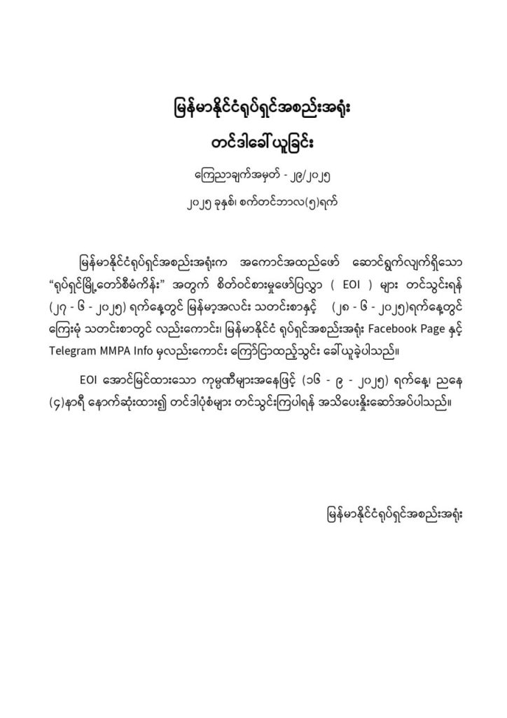 “ရုပ်ရှင်မြို့တော်စီမံကိန်း” အတွက် စိတ်ဝင်စားမှုဖော်ပြလွှာ EOI တွေ တင်သွင်းဖို့ ဇွန် ၂၇ ရက်က မြန်မာ့အလင်းသတင်းစာ၊ ဇွန် ၂၈ ရက်က ကြေးမုံသတင်းစာတွေနဲ့ မြန်မာနိုင်ငံရုပ်ရှင်အစည်းအရုံး Facebook Page နဲ့ Telegram MMPA Info က လည်း ကြော်ငြာ