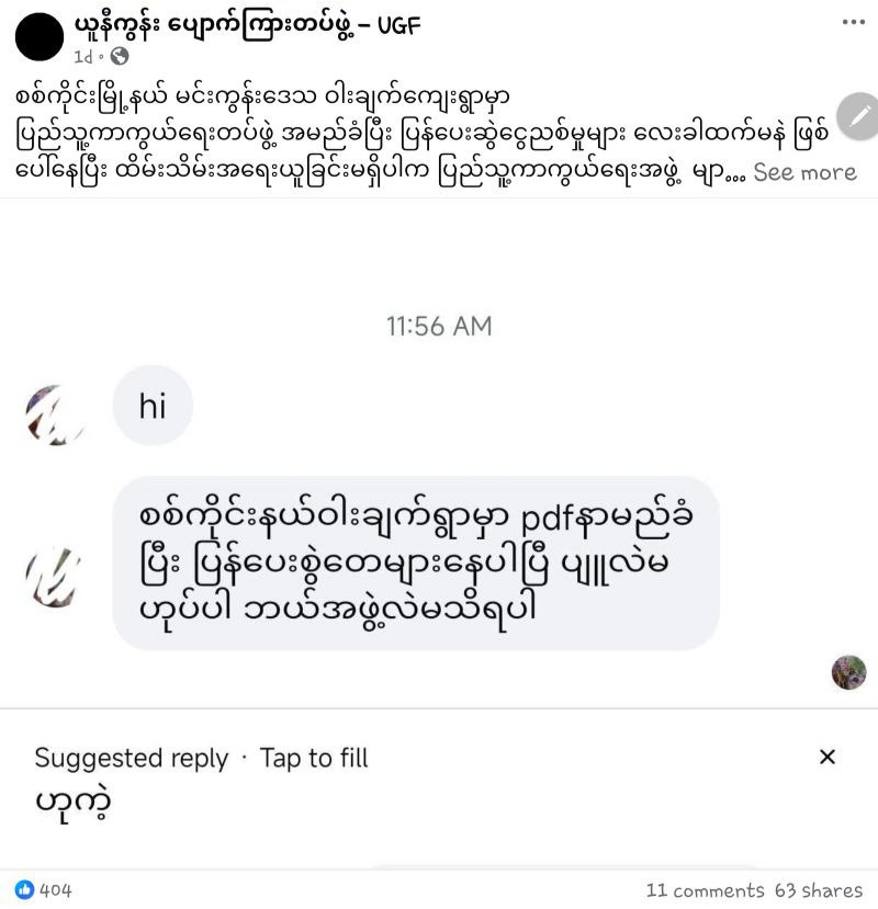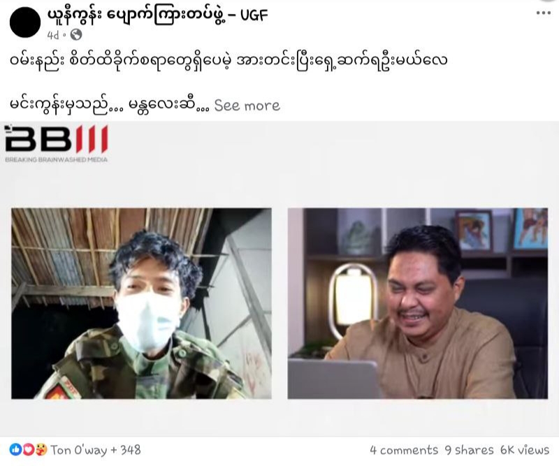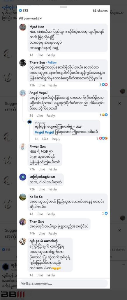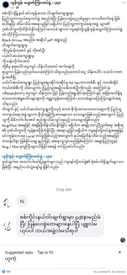 “စစ်ကိုင်းမြို့နယ် မင်းကွန်းဒေသ ဝါးချက်ကျေးရွာမှာ ပြည်သူ့ကာကွယ်ရေးတပ်ဖွဲ့ အမည်ခံပြီး ပြန်ပေးဆွဲငွေညှစ်မှုများ လေးခါထက်မနည်း ဖြစ်ပေါ်နေပြီး ထိမ်းသိမ်းအရေးယူခြင်းမရှိပါက ပြည်သူ့ကာကွယ်ရေးအဖွဲ့ များ၏ ဂုဏ်သိက္ခာကိုထိခိုက်နိုင်ကြောင်း ဒေသခံများက ကျွန်တော်တို့ ယူနီကွန်းပျောက်ကြားတပ်ဖွဲ့ထံ တိုင်ကြားလာသည်။ Black Arrow အမည်ခံ အဆိုပါ PDF အဖွဲ့သည် ဝါးချက်ကျေးရွာမှ ကိုလွှမ်းမိုးအောင်နှင့် ကိုဇော်ဦး၊ ပယ်ငါးဆယ်ကျေးရွာမှ ကိုသန်းထိုက်အောင်တို့စီမှ စုစုပေါင်းငွေကျပ် သိန်းငါးထောင် ထက်မနည်းကို ရယူကာ ပြန်လည် လွှတ်ပေးခဲ့ကြောင်းသိရသည် (တောင်းငွေ သိန်းပေါင်း သောင်းဂဏာန်းအထိရှိ)”ဟု UGF က ဖော်ထုတ်သည်။