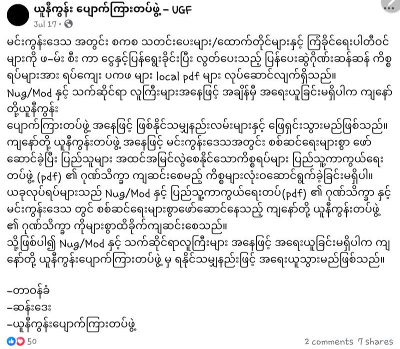 စစ်ကိုင်းမြို့နယ်၊ မင်းကွန်းဒေသ၊ ဝါးချက်ကျေးရွာနှင့် ပယ်ငါးဆယ်ကျေးရွာတို့မှ အပြစ်မဲ့ပြည်သူများကို NUG ဩဇာခံ Black Arrow PDF အဖွဲ့က ဖမ်းဆီးကာ ကျပ်သိန်း ၅၀၀၀ ထက်မနည်းသည့်ငွေဖြင့် ရွေးယူနေရမှု ဖြစ်ပွားနေသည်ဟု Local PDF အဖွဲ့ဖြစ်သော ယူနီကွန်း ပျောက်ကြားတပ်ဖွဲ့ – UGF က ဖော်ထုတ်လာသည်။