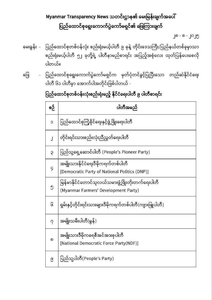 ပြည်ထောင်စုရွေးကောက်ပွဲကော်ရှင်က မှတ်ပုံတင်ခွင့်ပြုပြီးသော တည်ဆဲနိုင်ငံရေးပါတီ ၆၁ ခုအနက် နိုင်ငံရေးပါတီ ၉ ပါတီက ပြည်ထောင်စုတစ်ဝန်းလုံး မဲဆွယ်စည်းရုံးသွားမည်ဖြစ်ပြီး တိုင်းဒေသကြီးနှင့် ပြည်နယ်အတွင်းသာ မဲဆွယ်စည်းရုံးမည့်ပါတီ ၅၂ ပါတီဖြစ်ကြောင်း UEC က ဩဂုတ် ၂၈ ရက်တွင် ဖြေကြားထားသည်။