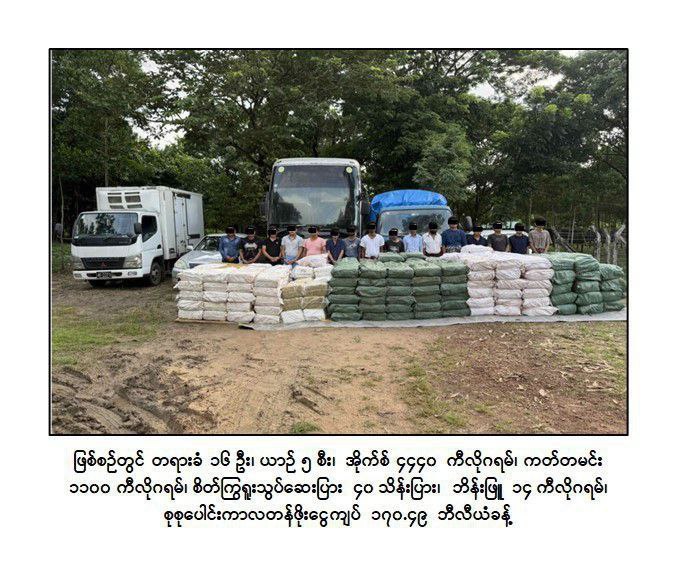 ဖြစ်စဉ်တွင် AA သောင်းကျန်းသူအဖွဲ့အနေဖြင့် မူးယစ်ဆေးဝါးသယ်ဆောင်ရောင်းဝယ်မှုများကို ပြုလုပ်ကာ ရရှိသည့်ငွေကြေးများဖြင့် လက်နက်၊ ခဲယမ်းများဝယ်ယူ၍ ရခိုင်ပြည်နယ်အတွင်း အကြမ်းဖက်လုပ်ငန်းများ လုပ်ဆောင်ခြင်း၊ လက်နက်အားကိုးဖြင့် အပြစ်မဲ့ပြည်သူများ အပေါ် အနိုင်ကျင့် နှိပ်စက်သတ်ဖြတ်ခြင်းများကို လုပ်ဆောင်လျက်ရှိသည်။ သို့ဖြစ်၍ မူးယစ်ဆေးဝါး သယ်ဆောင်ရောင်းဝယ်ခြင်းနှင့် အကြမ်းဖက်လုပ်ရပ်များကို မလိုလားသည့် ဒေသခံပြည်သူများ၏ သတင်းပေးပို့ချက်အရ ၂၀၂၅ ခုနှစ်၊ စက်တင်ဘာလ ၅ ရက် နံနက်ပိုင်းတွင် ရန်ကုန်တိုင်းဒေသကြီး၊ ရွှေပြည်သာမြို့နယ်၊ အမှတ်(၂၅)ရပ်ကွက်၊ အမှတ်(၄)လမ်းမကြီးရှိ အမှတ်၊ ၇(က)/၂ ဂိုဒေါင်အား ဝင်ရောက်ရှာဖွေခဲ့ရာ ရခိုင်ပြည်နယ်၊ ကျောက်တော်မြို့နေ AA သောင်းကျန်းသူအဖွဲ့မှ ထောက်ပံ့ရေး ဒုတိယတာဝန်ခံအဆင့်ရှိ မူးယစ်ဆေးဝါးတရားခံ ထွန်းထွန်းနိုင်နှင့် AA သောင်းကျန်းသူအဖွဲ့မှ ထောက်ပံ့ရေးအဖွဲ့ဝင် အေးသန်းထွန်း တို့အပါအဝင် မူးယစ်ဆေးဝါး တရားခံများဖြစ်သည့် အားလျံ (ခ)ဝမ်ရှင်းလျံ၊ ထွန်းထွန်းနိုင်(ခ)အယ်လ်တီ၊ အေးမြင့်နှင့် လင်းမင်းထက် တို့ ၆ ဦးအား ICE ၁,၈၄၀ ကီလိုဂရမ်၊ စိတ်ကြွရူးသွပ်ဆေးပြား သိန်း ၄၀ ပြား၊ ဘိန်းဖြူအမှုန့် ၁၄ ကီလိုဂရမ်၊ Mitsubishi Canter (အဖြူရောင်)ယာဉ် ၁ စီးတို့နှင့်အတူ ဖမ်းဆီးရမိခဲ့သည်။