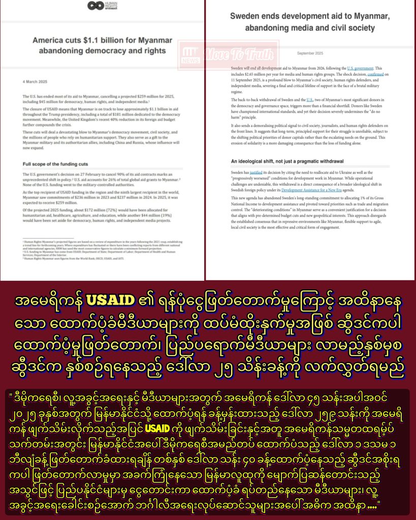ဒီမိုကရေစီ၊ လူ့အခွင့်အရေးနှင့် မီဒီယာများအတွက် အမေရိကန် ဒေါ်လာ ၄၅ သန်းအပါအဝင် ၂၀၂၅ ခုနှစ်အတွက် မြန်မာနိုင်ငံသို့ ထောက်ပံ့ရန် ခန့်မှန်းထားသည့် ဒေါ်လာ ၂၅၉ သန်းကို အမေရိကန် ဖျက်သိမ်းလိုက်သည့်အပြင် USAID ကို ဖျက်သိမ်းခြင်းနှင့်အတူ အမေရိကန်သမ္မတထရမ့်ပ်သက်တမ်းအတွင်း မြန်မာနိုင်ငံအပေါ် ဒီမိုကရေစီအမည်တပ် ထောက်ပံသည့် ဒေါ်လာ ၁ ဒသမ ၁ ဘီလျံခန့် ဖြတ်တောက်ခံထားရချိန် တစ်နှစ် ဒေါ်လာ သန်း ၄၀ ခန့်ထောက်ပံ့နေသည့် ဆွီဒင်အစိုးရကပါ ဖြတ်တောက်လာမှုမှာ အခက်ကြုံနေသော မြန်မာလူထုကို မျောက်ပြဆန်တောင်းသည့်အသွင်ဖြင့် ပြည်ပနိုင်ငံများမှ ငွေတောင်းကာ ထောက်ပံ့ခံ ရပ်တည်နေသော မီဒီယာများ၊ လူ့အခွင့်အရေးခေါင်းစဉ်အောက် ဘင်္ဂါလီအရေးလုပ်ဆောင်သူများအပေါ် အဓိက အထိနာသွားစေမည်ဖြစ်သည်။