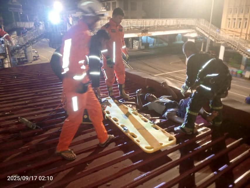 ခေါင်မိုးပေါ်ပြုတ်ကျတင်ကျန်နေသော အလုပ်သမားကို မီးသတ်တပ်ဖွဲ့ဝင်များက ၂၉ မိနစ်ကြာ ကယ်ဆယ်ခဲ့ရကြောင်း သိရသည်။