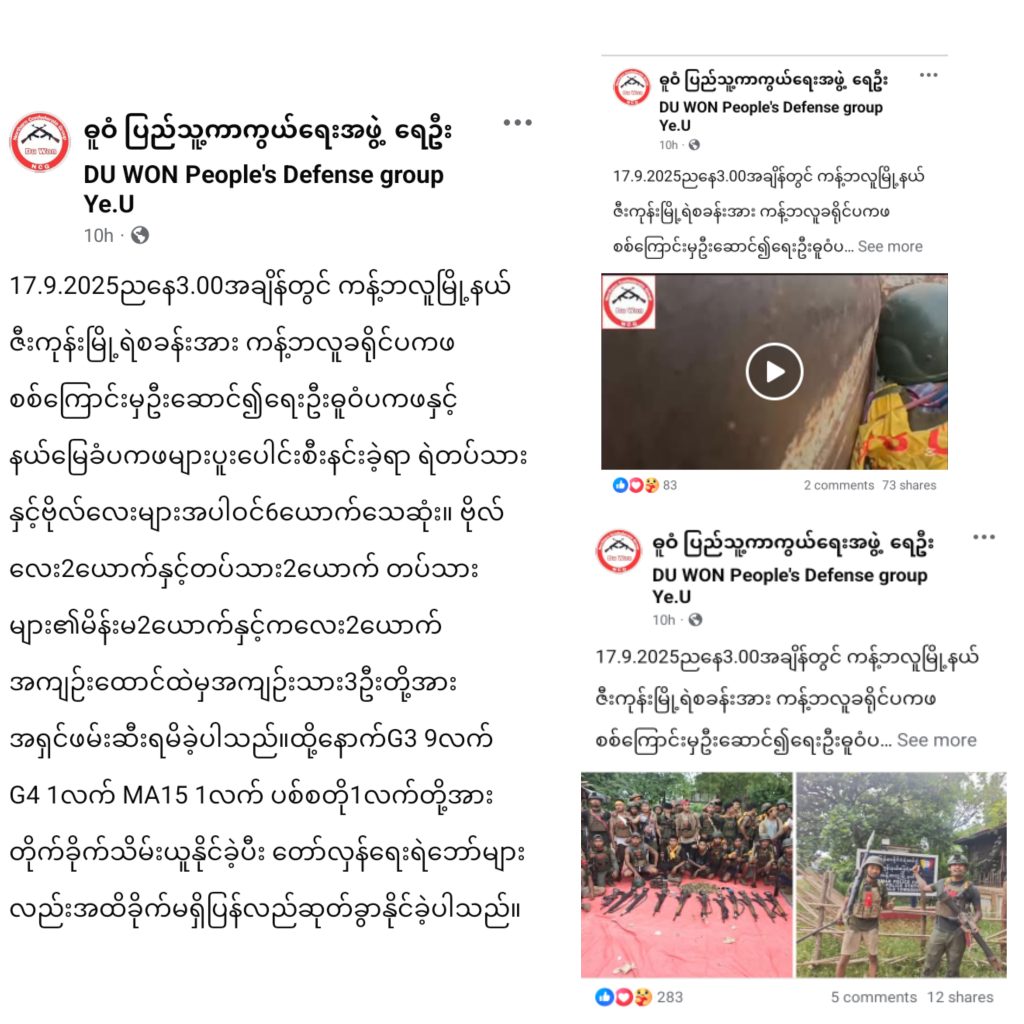 ဒါ့အပြင် လက်နက်တွေအဖြစ် G 3 ၉ လက်၊ G 4 ၁ လက်၊ MA 15 ၁ လက်၊ ပစ္စတို ၁ လက်တို့ သိမ်းယူခဲ့သလို ဇီးကုန်းရဲစခန်းကိုလည်း PDF တွေက မီးရှို့ခဲ့ကြတာ တွေ့ရပါတယ်။