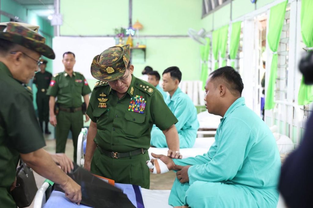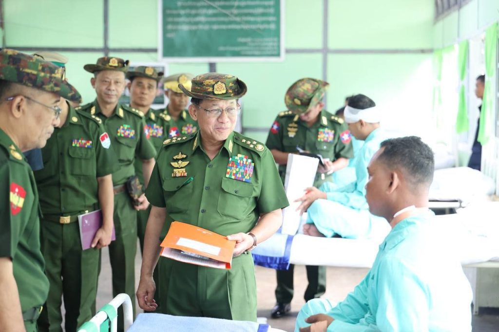 ထို့နောက် တပ်မတော်ကာကွယ်ရေးဦးစီးချုပ်သည် တပ်နယ်ရှိ နယ်မြေခံတပ်မတော်ဆေးရုံတွင် တက်ရောက်ကုသလျက်ရှိသည့် နိုင်ငံတော်ကာကွယ်ရေးနှင့် လုံခြုံရေးတာဝန်များ ထမ်းဆောင်စဉ် ထိခိုက်ဒဏ်ရာရရှိခဲ့သော အရာရှိ၊ စစ်သည်များအား ထိခိုက်ဒဏ်ရာရရှိခဲ့မှု အခြေအနေများ၊ ရောဂါကုသပျောက်ကင်းမှု အခြေအနေများကို တစ်ဦးချင်း လိုက်လံတွေ့ဆုံ၍ အားပေးစကားပြောကြားကာ အရာရှိ၊ စစ်သည်များ၏ တင်ပြချက်များအပေါ် လိုအပ်သည်များ ဖြည့်ဆည်း ဆောင်ရွက်ပေးခဲ့ကြောင်း သိရသည်။