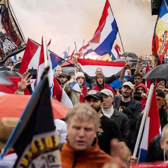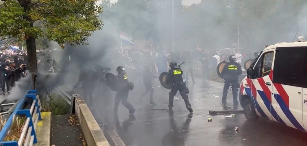 ဆန္ဒပြသမားအများအပြားက နယ်သာလန်နိုင်ငံအလံတွေကို ဝှေ့ယမ်းနေကြပြီး လက်ယာစွန်းအုပ်စုတွေနဲ့ ဆက်နွှယ်နေသူတွေပါ။ သူတို့က ရဲတပ်ဖွဲ့ဝင်တွေကို ကျောက်ခဲတွေ၊ ပုလင်းတွေနဲ့ ပစ်ပေါက်ခဲ့တယ် လို့ ဒတ်ခ်ျလူထုရုပ်သံ NOS ကထုတ်လွှင့်တဲ့ ဗီဒီယိုဖိုင်မှာ တွေ့ရပါတယ်။