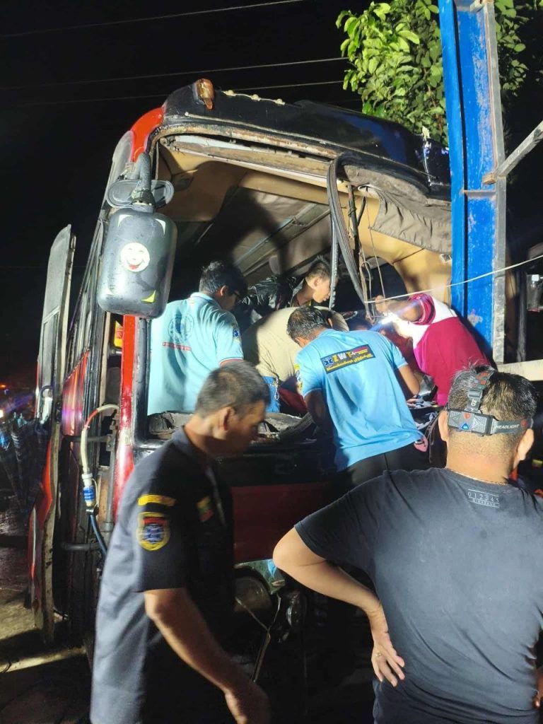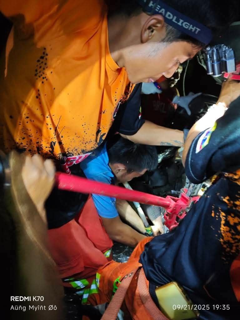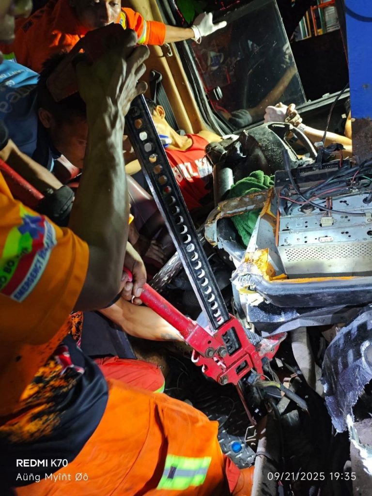 ” ယာဉ်ပေါ်က ယာဉ်မောင်းပဲ ဒဏ်ရာရခဲ့တာ။ ဒဏ်ရာရသူ တစ်ဦးပါပဲ။ ကားထဲညပ်နေတော့ အောက်ဆီဂျင်ပေးပြီး အချိန် နာရီဝက်နီးပါး ကြာအောင် မြန်မာနိုင်ငံမီးသတ်ဦးဆောင်ပြီး မော်လမြိုင် အရေးပေါ်ကယ်ဆယ်ရေးအဖွဲ့တွေက ဝိုင်းဝန်းကူညီ ဆွဲထုတ်ခဲ့ရတယ်” လို့ မုဒုံ လူမှုကူညီရေးအဖွဲ့ တာဝန်ရှိသူက ဆိုပါတယ်။