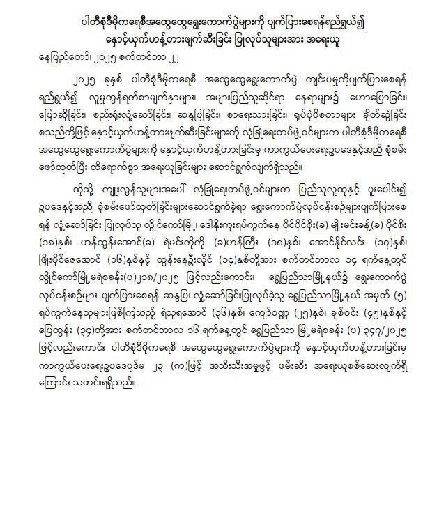 ၂၀၂၅ ခုနှစ် ပါတီစုံဒီမိုကရေစီ အထွေထွေရွေးကောက်ပွဲကျင်းပမှုကို ပျက်ပြားစေရန်ရည်ရွယ်၍ လူမှုကွန်ရက်စာမျက်နှာများ၊ အများပြည်သူဆိုင်ရာနေရာများ၌ ဟောပြောခြင်း၊ ပြောဆိုခြင်း၊ စည်းရုံးလှုံ့ဆော်ခြင်း၊ ဆန္ဒပြခြင်း၊ စာရေးသားခြင်း၊ ရုပ်ပုံပိုစတာများချိတ်ဆွဲခြင်း စသည်တို့ဖြင့် နှောင့်ယှက်ဟန့်တားဖျက်ဆီးခြင်းများကို လုံခြုံရေးတပ်ဖွဲ့ဝင်များက ပါတီစုံဒီမိုကရေစီ အထွေထွေရွေးကောက်ပွဲများကို နှောင့်ယှက်ဟန့်တားခြင်းမှ ကာကွယ်ပေးရေးဥပဒေနှင့်အညီ စုံစမ်းဖော်ထုတ်ပြီး ထိရောက်စွာအရေးယူခြင်းများ ဆောင်ရွက်လျက်ရှိရာ ယခုလည်း ပါတီစုံဒီမိုကရေစီအထွေထွေရွေးကောက်ပွဲများကို ပျက်ပြားစေရန် ရည်ရွယ်၍ နှောင့်ယှက်ဟန့်တားဖျက်ဆီးခြင်း ပြုလုပ်သူ ၉ ဦးကို ထပ်မံ ဖမ်းဆီး အရေးယူလိုက်ပြီဖြစ်သည်။
