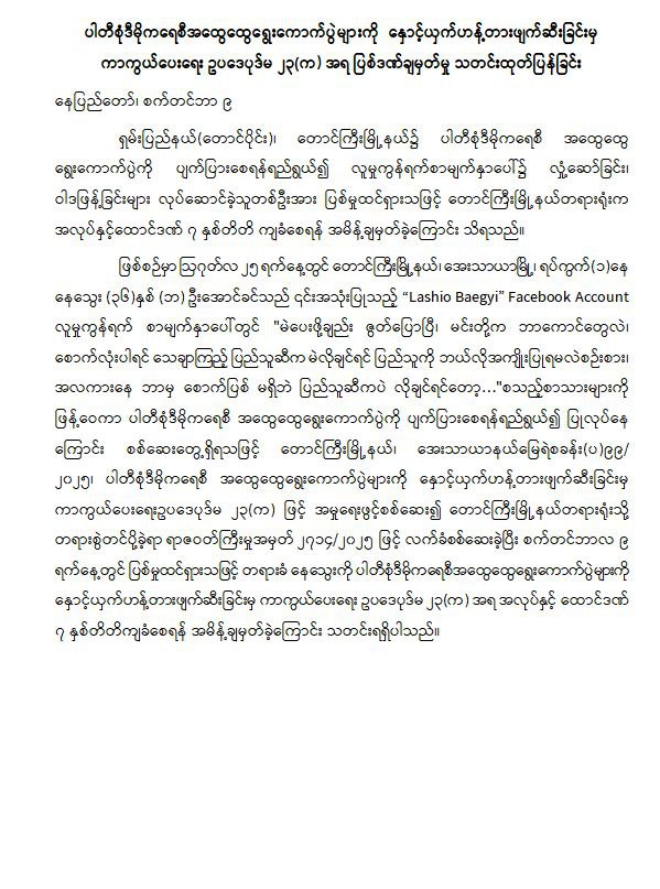 ပါတီစုံဒီမိုကရေစီအထွေထွေရွေးကောက်ပွဲများကို ပျက်ပြားစေရန် ရည်ရွယ်၍ နှောင့်ယှက်ဟန့်တားဖျက်ဆီးခြင်း ပြုလုပ်သူ ၉ ဦးမှာ လွိုင်ကော်မြို့၊ ဒေါနိုးကူးရပ်ကွက်နေ ပိုင်ပိုင်စိုး(ခ) မျိုးမင်းခန့်(ခ)ပိုင်စိုး (၁၈)နှစ်၊ ဟန်ထွန်းအောင်(ခ) ရဲမင်းကိုကို (ခ)ဟန်ကြီး (၁၈)နှစ်၊ အောင်နိုင်လင်း (၁၇)နှစ်၊ ဖြိုးပိုင်ဇေအောင် (၁၆)နှစ်နှင့် ထွန်းနေဦးလှိုင် (၁၄)နှစ်တို့အား စက်တင်ဘာလ ၁၄ ရက်နေ့တွင် လွိုင်ကော်မြို့မရဲစခန်း (ပ)၂၁၈/၂၀၂၅ ဖြင့်လည်းကောင်း၊ ရွှေပြည်သာမြို့နယ်၌ ရွေးကောက်ပွဲလုပ်ငန်းစဉ်များ ပျက်ပြားစေရန် ဆန္ဒပြ၊ လှုံ့ဆော်ခြင်းပြုလုပ်ခဲ့သူ ရွှေပြည်သာမြို့နယ် အမှတ်(၅)ရပ်ကွက်နေသူများဖြစ်ကြသည့် ရဲသူရအောင် (၃၆)နှစ်၊ ကျော်ဝဏ္ဏ (၂၅)နှစ်၊ ချစ်ဝင်း (၄၅)နှစ်နှင့် ပြေထွန်း (၃၄)နှစ်တို့အား စက်တင်ဘာလ ၁၆ ရက်နေ့တွင် ရွှေပြည်သာမြို့မရဲစခန်း (ပ) ၃၄၇/၂၀၂၅ ဖြင့်လည်းကောင်း ပါတီစုံဒီမိုကရေစီ အထွေထွေရွေးကောက်ပွဲများကို နှောင့်ယှက်ဟန့်တားခြင်းမှ ကာကွယ်ပေးရေးဥပဒေပုဒ်မ ၂၃ (က)ဖြင့် အသီးသီးအမှုဖွင့် ဖမ်းဆီးအရေးယူစစ်ဆေးလျက်ရှိကြောင်း သတင်းရရှိသည်။