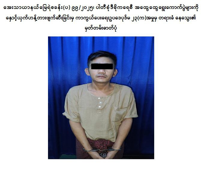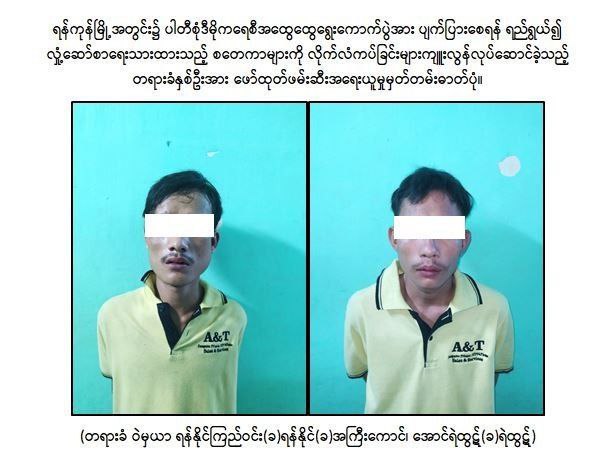 ထို့အပြင် အထွေထွေရွေးကောက်ပွဲများ ပျက်ပြားစေရန် ရည်ရွယ်၍ လှုံ့ဆော်စာရေးသားထားသည့် စတေကာများ လိုက်လံကပ်သူလှိုင်သာယာ(အရှေ့ပိုင်း)မြို့နယ်၊ အမှတ်(၆)ရပ်ကွက်နေသူများဖြစ်ကြသည့် အောင်ရဲထွဋ်(ခ)ရဲထွဋ်(၂၄)နှစ်နှင့် ရန်နိုင်ကြည်ဝင်း(ခ)ရန်နိုင်(ခ) အကြီးကောင်(၂၃)နှစ်တို့ကို ဖော်ထုတ်ဖမ်းဆီးအရေးယူကာ လှိုင်သာယာ (အရှေ့ပိုင်း)မြို့မရဲစခန်း(ပ)၈၁၇/၂၀၂၅၊ ပါတီစုံဒီမိုကရေစီ အထွေထွေ ရွေးကောက်ပွဲများကို နှောင့်ယှက်ဟန့်တားဖျက်ဆီးခြင်းမှ ကာကွယ်ရေးဥပဒေပုဒ်မ ၂၃(က)ဖြင့် အမှုဖွင့်လှစ်ထားသည်ဟု စက်တင်ဘာ ၁၉ ရက်တွင် ကြေညာခဲ့သည်။