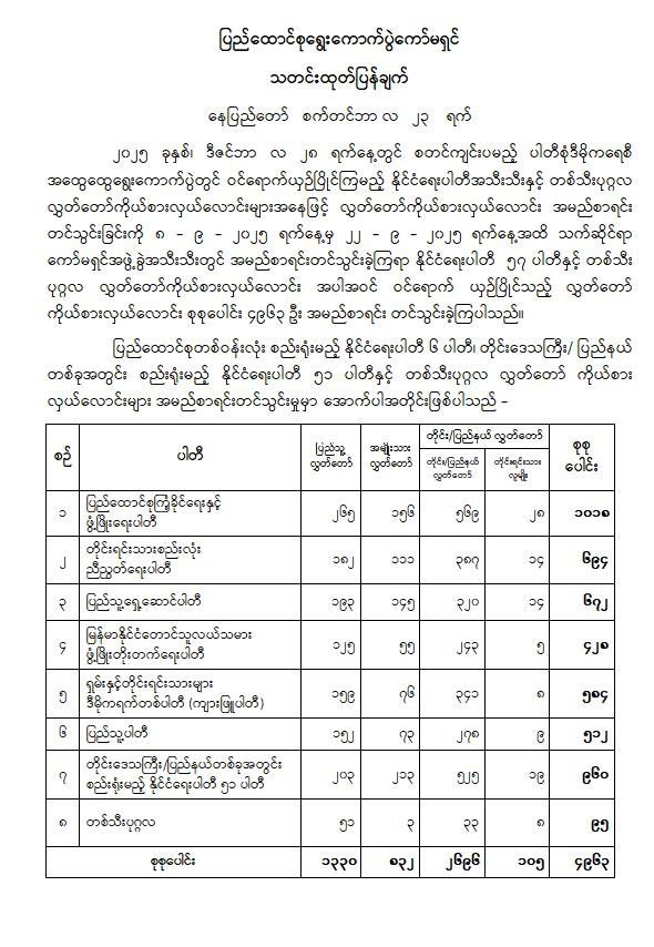ပြည်ထောင်စုတစ်ဝန်းလုံး စည်းရုံးမည့်နိုင်ငံရေးပါတီများဖြစ်သည့် ပြည်ထောင်စုကြံ့ခိုင်ရေးနှင့် ဖွံ့ဖြိုးရေးပါတီမှ စုစုပေါင်း ၁,၀၁၈ ဦး၊ တိုင်းရင်းသားစည်းလုံးညီညွတ်ရေးပါတီမှ စုစုပေါင်း ၆၉၄ ဦး၊ ပြည်သူ့ရှေ့ဆောင်ပါတီမှ စုစုပေါင်း ၆၇၂ ဦး၊ မြန်မာနိုင်ငံတောင်သူလယ်သမား ဖွံ့ဖြိုးတိုးတက်ရေးပါတီမှ စုစုပေါင်း ၄၂၈ ဦး၊ ရှမ်းနှင့်တိုင်းရင်းသားများဒီမိုကရက်တစ်ပါတီ (ကျားဖြူပါတီ)မှ စုစုပေါင်း ၅၈၄ ဦးနှင့် ပြည်သူပါတီမှ စုစုပေါင်း ၅၁၂ ဦး အမည်စာရင်း တင်သွင်းခဲ့ကြောင်း သိရသည်။