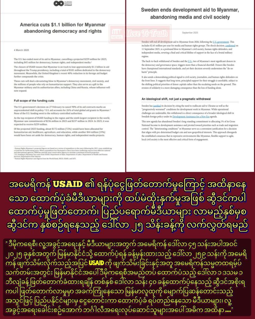 အမေရိကန်သမ္မတအဖြစ် ဒေါ်နယ်ဒ် ထရမ့်ပ် တစ်ကျော့ပြန်တက်လာချိန်မှာ ဒီမိုကရေစီ၊ လူ့အခွင့်အရေးနဲ့ မီဒီယာတွေအတွက် အမေရိကန် ဒေါ်လာ ၄၅ သန်းအပါအဝင် ၂၀၂၅ ခုနှစ်အတွက် မြန်မာနိုင်ငံကို ထောက်ပံ့ဖို့ ခန့်မှန်းထားတဲ့ ဒေါ်လာ ၂၅၉ သန်းကို ဖျက်သိမ်းလိုက်တာပါ။ ဒီလိုမျိုး ဒေါ်လာ သန်းရာချီ ငွေကြေးထောက်ပံ့မှုကို လုပ်ဆောင်ပေးနေတဲ့ USAID ကို ဖျက်သိမ်းမှုနဲ့အတူ ထရမ့်ပ်သက်တမ်းအတွင်း မြန်မာနိုင်ငံအပေါ် ဒီမိုကရေစီအမည်တပ် ထောက်ပံတဲ့ ဒေါ်လာ ၁ ဒသမ ၁ ဘီလျံခန့်ပါ ဖြတ်တောက်ခံရချိန်မှာ တစ်နှစ်ကို ဒေါ်လာ သန်း ၄၀ ခန့်ထောက်ပံ့နေတဲ့ ဆွီဒင်အစိုးရကပါ လာမယ့်နှစ်ကစ မြန်မာနိုင်ငံကို ငွေကြေးထောက်ပံ့မှုဖြတ်တောက်မယ်လို့ ကြေညာလာတာဟာ ပြည်တွင်းမှာဖြစ်ပွားနေတဲ့ စစ်ပွဲတွေကြောင့် အခက်ကြုံနေရတဲ့ မြန်မာလူထုကို မျောက်ပြဆန်တောင်းတဲ့ပုံစံနဲ့ ပြည်ပနိုင်ငံတွေဆီက ငွေတောင်းခံပြီး ရပ်တည်နေတဲ့ မီဒီယာတွေ၊ လူ့အခွင့်အရေးခေါင်းစဉ်အောက် ဘင်္ဂါလီအရေးလုပ်ဆောင်သူတွေ အဓိက အထိနာစေခဲ့ပါတယ်။