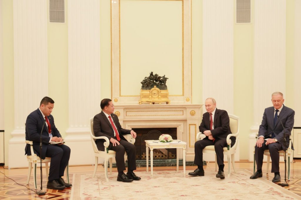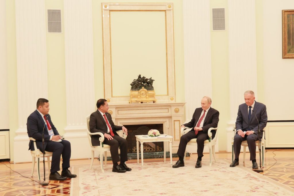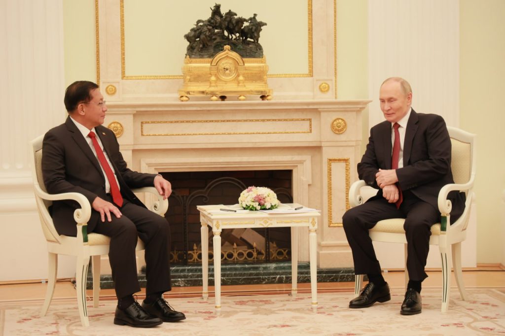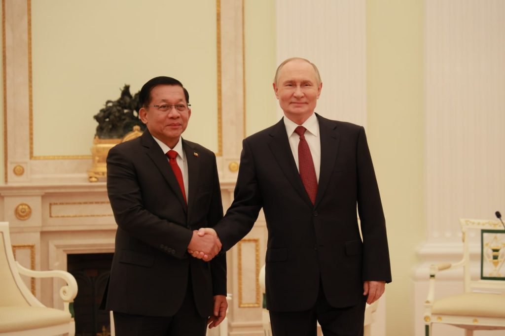 ရုရှားဖက်ဒရေးရှင်းနိုင်ငံ သမ္မတ မစ္စတာ ဗလာဒီမာပူတင်၏ ဖိတ်ကြားချက်အရ ရုရှားဖက်ဒရေးရှင်းနိုင်ငံသို့အလုပ်သဘောခရီးရောက်ရှိနေသည့် ပြည်ထောင်စုသမ္မတမြန်မာနိုင်ငံတော် ယာယီသမ္မတ နိုင်ငံတော်လုံခြုံရေးနှင့် အေးချမ်းသာယာရေး ကော်မရှင်ဥက္ကဋ္ဌဗိုလ်ချုပ်မှူးကြီး မင်းအောင်လှိုင်သည် ယမန်နေ့ညပိုင်းတွင် မော်စကိုမြို့ ကရင်မလင်နန်းတော်၌ ရုရှားဖက်ဒရေးရှင်းနိုင်ငံသမ္မတ H.E.Vladimir Vladimirovich Putin နှင့် တွေ့ဆုံဆွေးနွေးသည်။