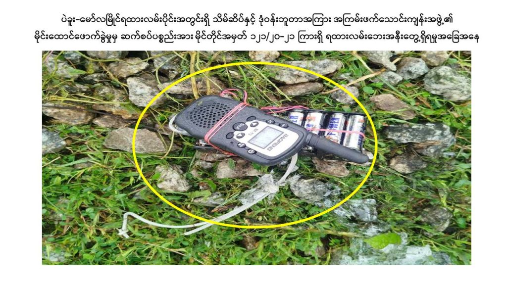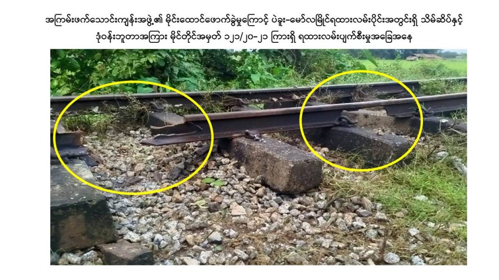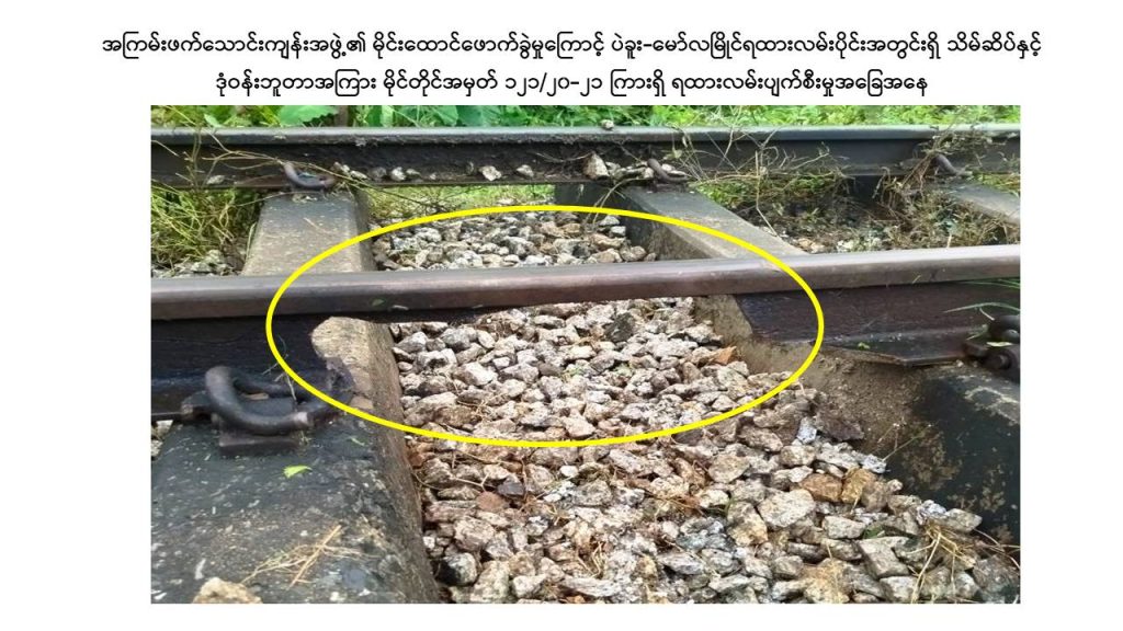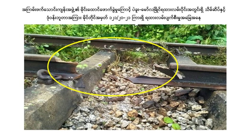 မိုင်းပေါက်ကွဲမှုဖြစ်စဉ် ဖြစ်ပွားရာ ရထားလမ်းနေရာသို့ နယ်မြေဒေသတာဝန်ရှိသူများ၊ နယ်မြေခံလုံခြုံရေးတပ်ဖွဲ့ဝင်တို့က ယနေ့နံနက်ပိုင်းတွင် နယ်မြေရှင်းလင်းစစ်ဆေး ဆောင်ရွက်ရာတွင် မိုင်းဒဏ်ကြောင့် အရှေ့ဘက်ရထားသံလမ်းသည် (၁)ပေခွဲခန့် (၁)နေရာပြတ်တောက်ခြင်း၊ ယင်းနေရာနှင့် ၃ ပေခန့်အကွာ(၁)နေရာတွင် သံလမ်းဖိနပ်(၁)ပေခွဲခန့် ပြတ်ထွက်ခြင်းတို့ဖြစ်ပေါ်ခဲ့ပြီး ရထားလမ်းပျက်စီးခဲ့ကြောင်း သိရှိရသည်။