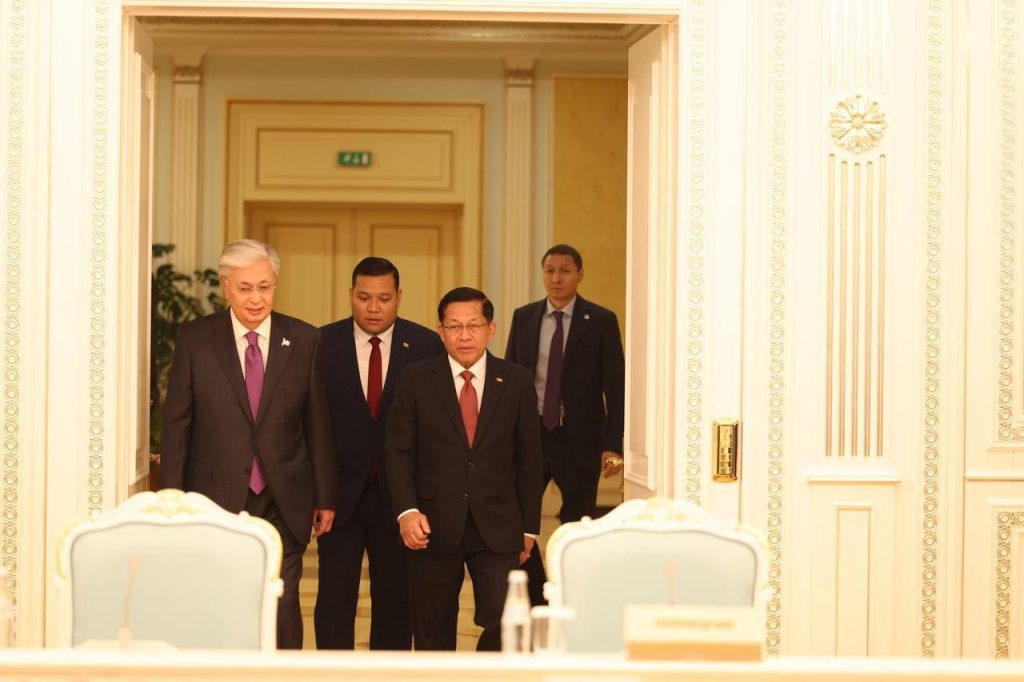 ထို့နောက် သမ္မတနန်းတော် ဧည့်ခန်းမဆောင်၌ တွေ့ဆုံဆွေးနွေးကြရာ ကာဇက်စတန်သမ္မတနိုင်ငံ သမ္မတက ပြည်ထောင်စုသမ္မတမြန်မာနိုင်ငံတော် ယာယီသမ္မတ နိုင်ငံတော်လုံခြုံရေးနှင့် အေးချမ်းသာယာရေး ကော်မရှင်ဥက္ကဋ္ဌ ဦးဆောင်သည့်အဖွဲ့ဝင်များအား ကာဇက်စတန်နိုင်ငံမှ လှိုက်လှဲနွေး ထွေးစွာကြိုဆိုပါကြောင်း၊ အဆွေတော်သည် ကာဇက်စတန်နိုင်ငံသို့ ပထမဦးဆုံး လာရောက်သည့် မြန်မာနိုင်ငံမှ ခေါင်းဆောင်တစ်ဦးလည်းဖြစ်ကြောင်း၊ မိမိအနေဖြင့် မြန်မာနိုင်ငံသမိုင်းကြောင်းဆိုင်ရာ၊ ယဉ်ကျေးမှုနှင့် ပထဝီဝင်အနေအထားအရ အချက်အခြာကျသည့်နေရာတွင် တည်ရှိနေသည်ကို လေ့လာသိရှိရကြောင်း၊ မြန်မာနိုင်ငံနှင့် စီးပွားရေးဆိုင်ရာ ပူးပေါင်းဆောင်ရွက်မှုများကို ဆောင်ရွက်သွားရန် မိမိတို့အနေဖြင့် အသင့်ရှိကြောင်း ပြောကြားသည်။