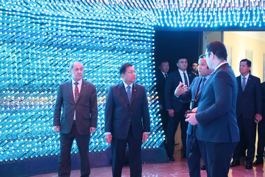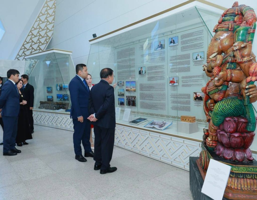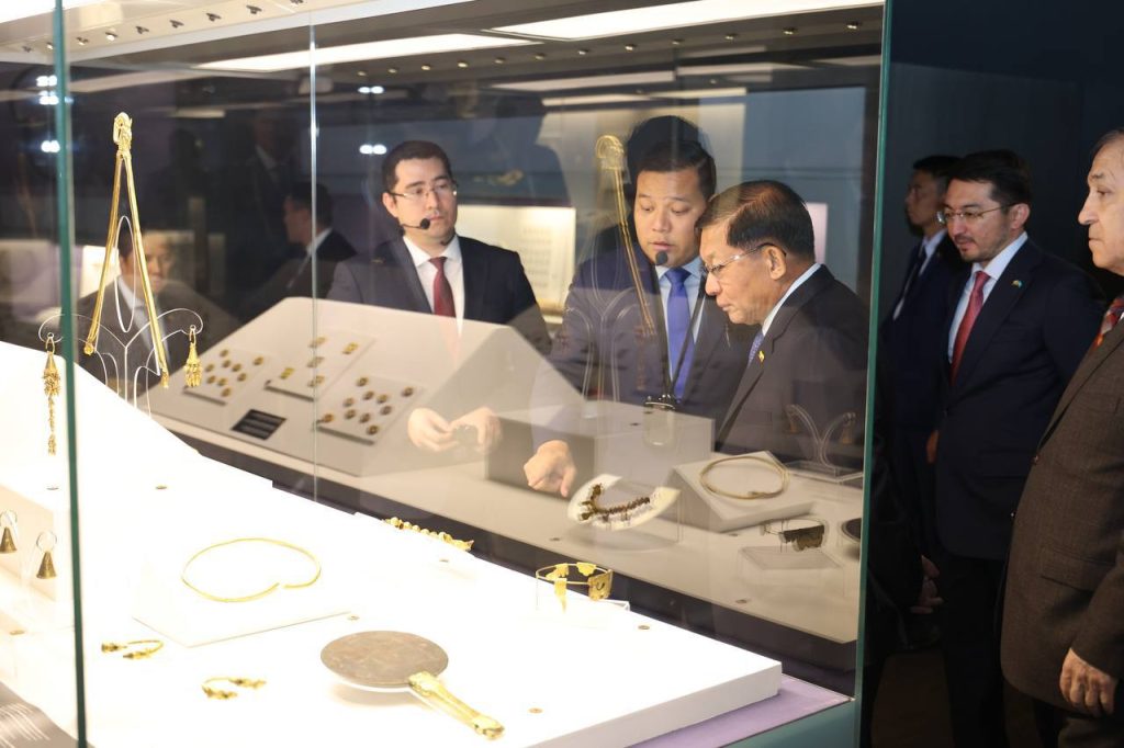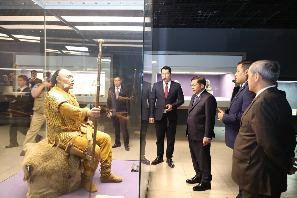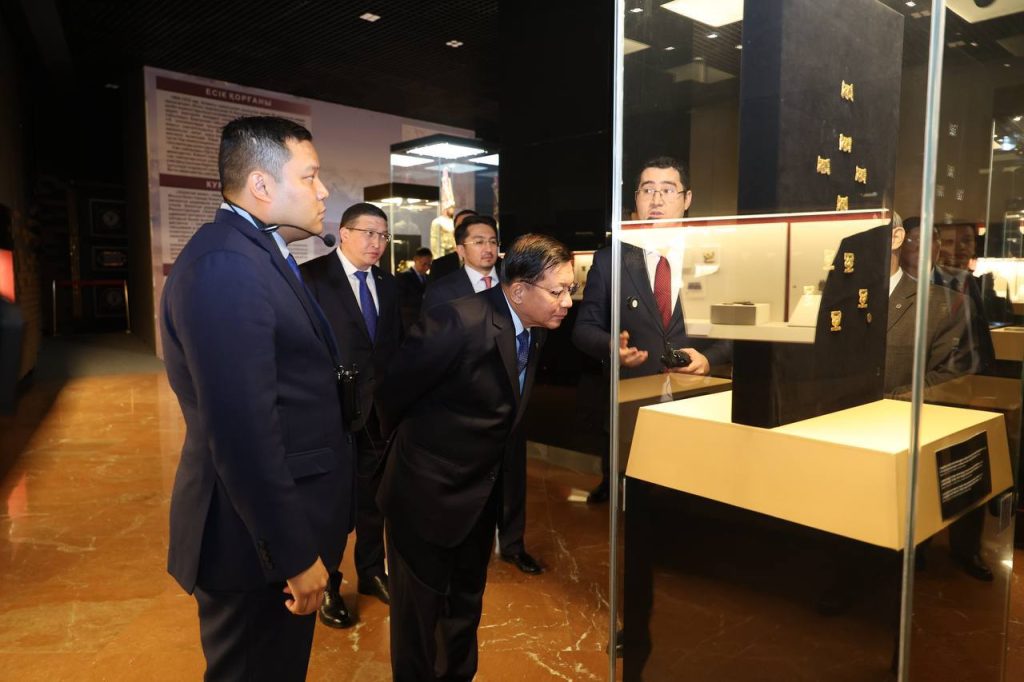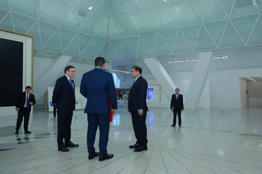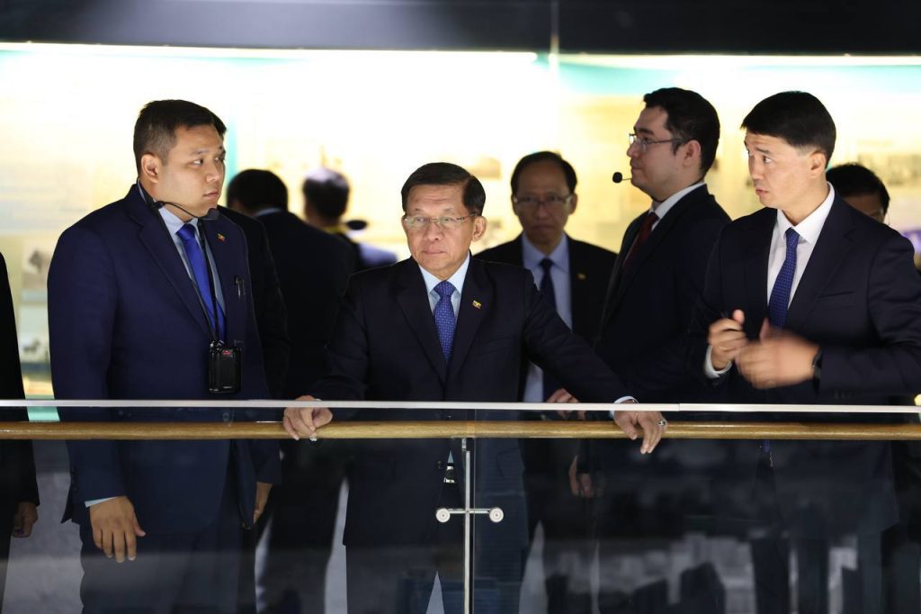ယင်းနောက် ယာယီသမ္မတ ဗိုလ်ချုပ်မှူးကြီးမင်းအောင်လှိုင်နှင့် အဖွဲ့ဝင်များသည် အမျိုးသားပြတိုက်သို့ ရောက်ရှိကြရာ ပြတိုက်မှ အထွေထွေရေးရာ ဒုတိယညွှန်ကြားရေးမှူး Mr. Sairan T Temirgalievich နှင့် တာဝန်ရှိသူများက ကြိုဆိုနှုတ်ဆက်ခဲ့ကြပြီးနောက် အမျိုးသားပြတိုက်အတွင်း လှည့်လည်၍ ကာဇက်စတန်လူမျိုးနှင့် နိုင်ငံ၏ သမိုင်းကြောင်း နောက်ခံအကြောင်းအရာများ၊ အဆင့်ဆင့်ဖြစ်ပေါ်ပြောင်းလဲတိုးတက်မှုများ ၊ ရိုးရာဓလေ့ထုံးတမ်းစဉ်လာဆိုင်ရာများ၊ ဖွံ့ဖြိုးတိုးတက်မှုများကို လှည့်လည်ကြည့်ရှုလေ့လာကြပြီး တာဝန်ရှိသူများ၏ ရှင်းလင်းပြောကြားမှုများအပေါ် ယာယီသမ္မတ ဗိုလ်ချုပ်မှူးကြီးမင်းအောင်လှိုင်က သိရှိလိုသည်များ ပြန်လည်မေးမြန်းဆွေးနွေးသည်။