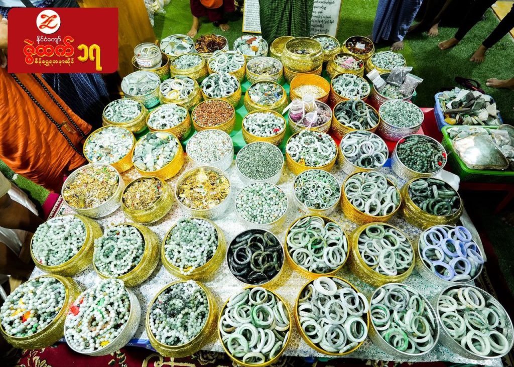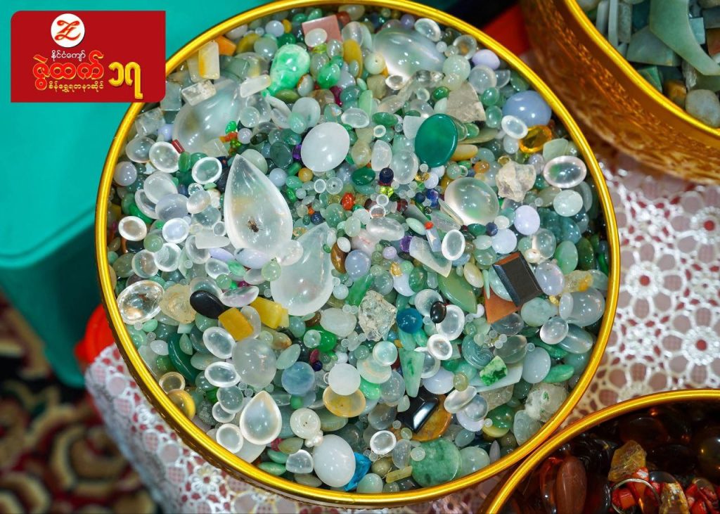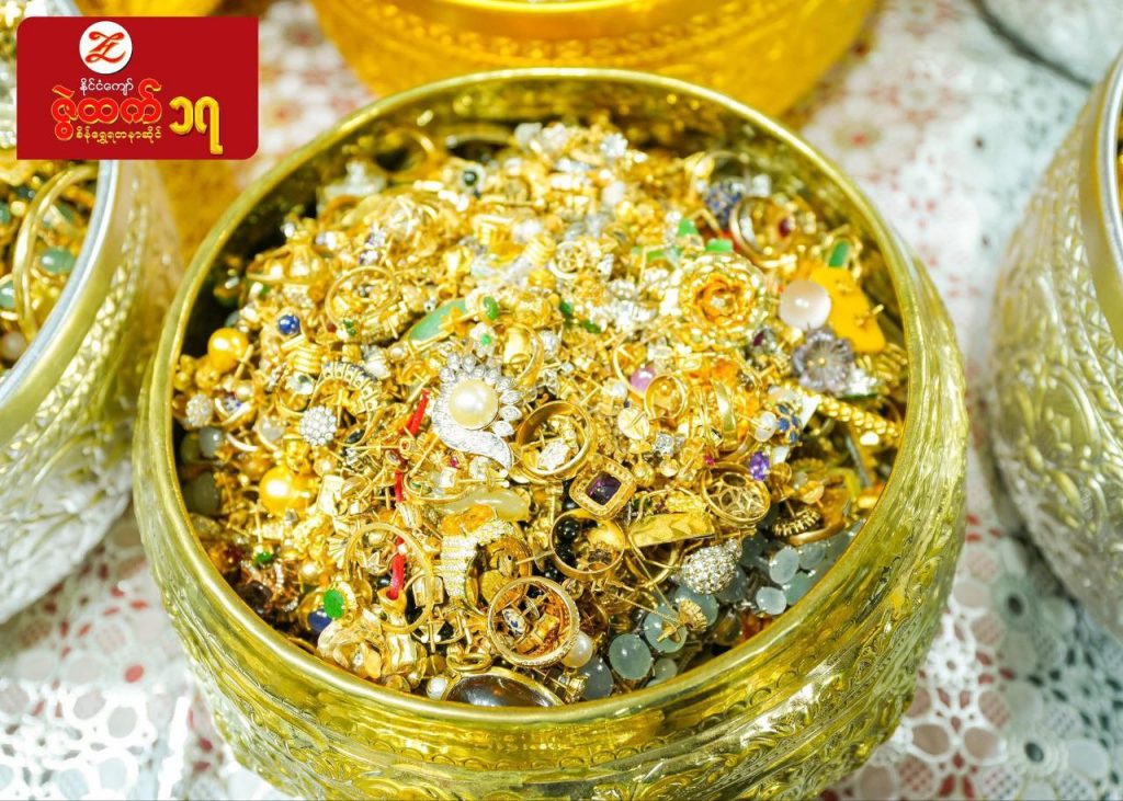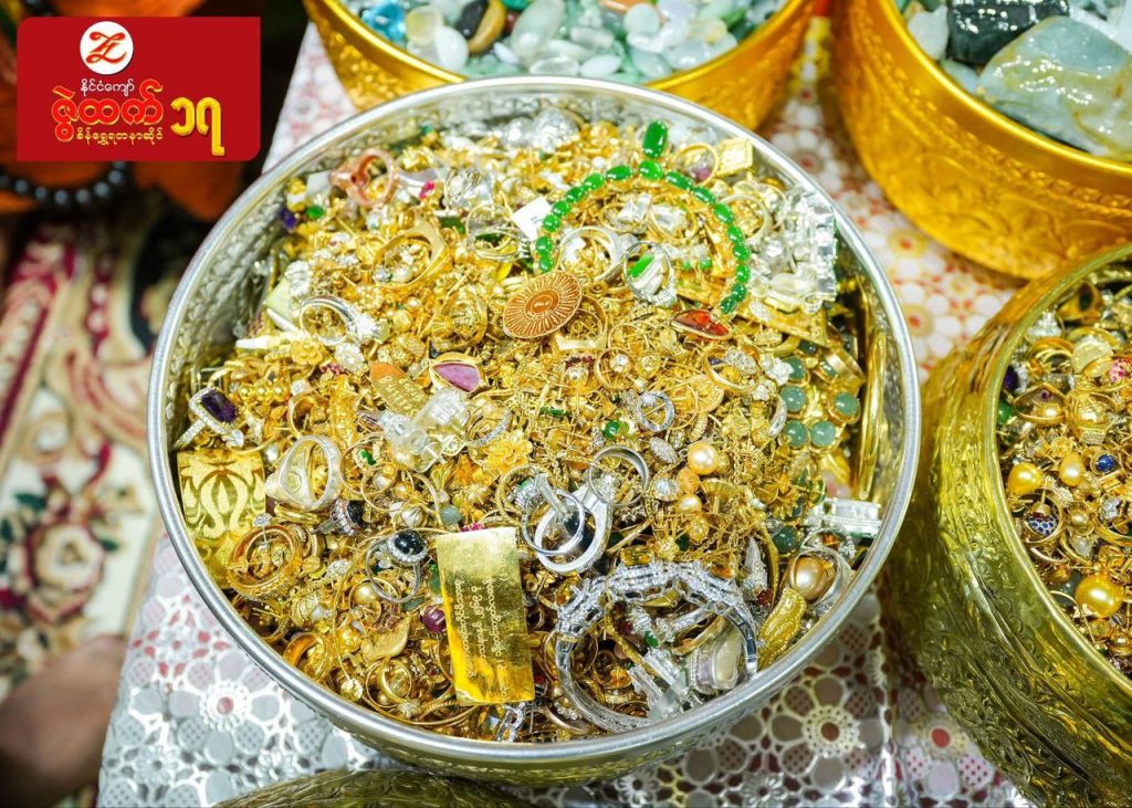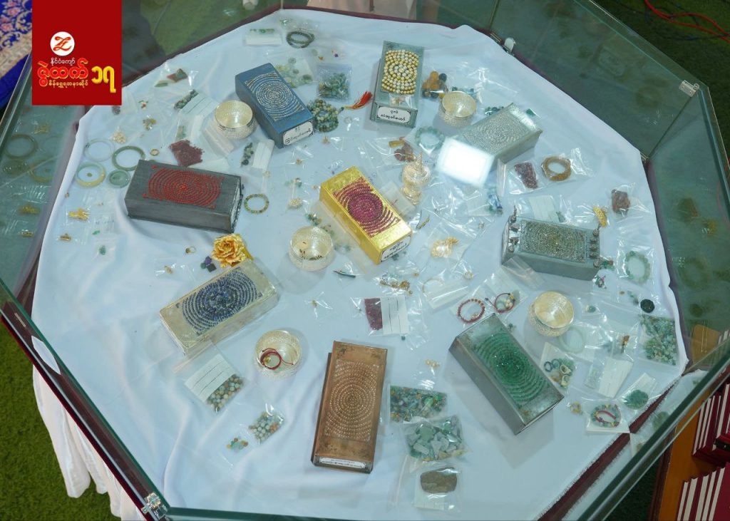 ကျပ် သိန်းပေါင်း ၉၀၀၀၀ ခန့် အကုန်အကျခံလှူဒါန်းမည့် မစိုးရိမ်ကျောင်းတိုက် တည်ဆောက်မှုတွင် ဌာပနာတည်ရန် ပြည်သူများက လာရောက်လှူဒါန်းထားသည့် ကျောက်မျက်ရတနာများကို ဇွဲထက် စိန်ရွှေရတနာဆိုင်က ယနေ့ ပြသထားသည်။