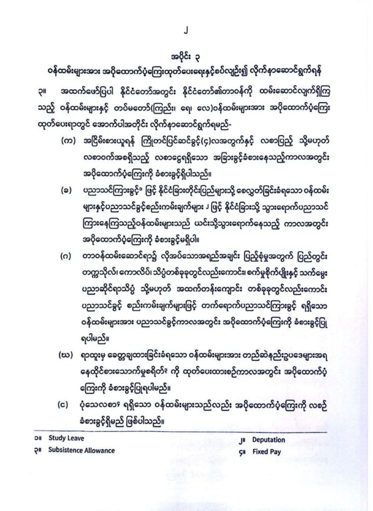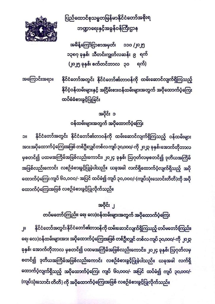 အောက်တိုဘာ ၁ ရက် (မနက်ဖြန်)မှစတင်၍ နိုင်ငံ့ဝန်ထမ်းနှင့် တပ်မတော်သား ဝန်ထမ်းများအတွက် လက်ရှိထောက်ပံ့ကြေး ကျပ် ၆၀,၀၀၀ အပြင် ထပ်မံ၍ ကျပ် ၃၀,၀၀၀၊ အငြိမ်းစားဝန်ထမ်းများအတွက် လက်ရှိထောက်ပံ့ကြေး ကျပ် ၃၀,၀၀၀ အပြင် ထပ်မံ၍ ကျပ် ၃၀,၀၀၀ နှင့် နေ့စားလုပ်သမားများအတွက် လက်ရှိထောက်ပံ့ကြေး ကျပ် ၂,၀၀၀ အပြင် ကျပ် ၁,၀၀၀ အား ထောက်ပံ့ကြေး ထပ်မံတိုးမြှင့်ပေးမည်ဖြစ်ကြောင်း ဘဏ္ဍာရေးနှင့်အခွန်ဝန်ကြီးဌာနမှ ယနေ့တွင် ထုတ်ပြန်ထားသည်။
