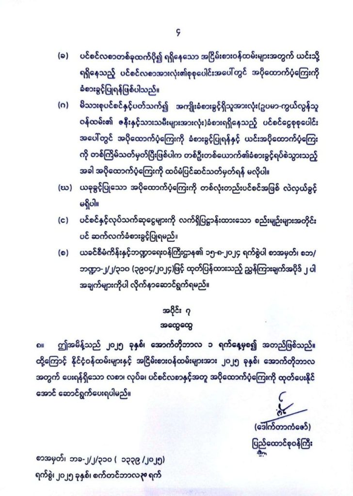 ဘဏ္ဍာရေးနှင့်အခွန်ဝန်ကြီးဌာနသည် နိုင်ငံတော်၏ တာဝန်ကို ထမ်းဆောင်လျက်ရှိကြသည့် နိုင်ငံ့ဝန်ထမ်းများနှင့် အငြိမ်းစားဝန်ထမ်းများအတွက် အပိုထောက်ပံ့ကြေး ထပ်မံခံစားခွင့်ပြုသည့် အမိန့်ကြော်ငြာစာအမှတ် (၁၁၀/၂၀၂၅) အား ၂၀၂၅ ခုနှစ်၊ စက်တင်ဘာလ ၃၀ ရက် (ယနေ့) ရက်စွဲဖြင့် ထုတ်ပြန်ခဲ့သည်။