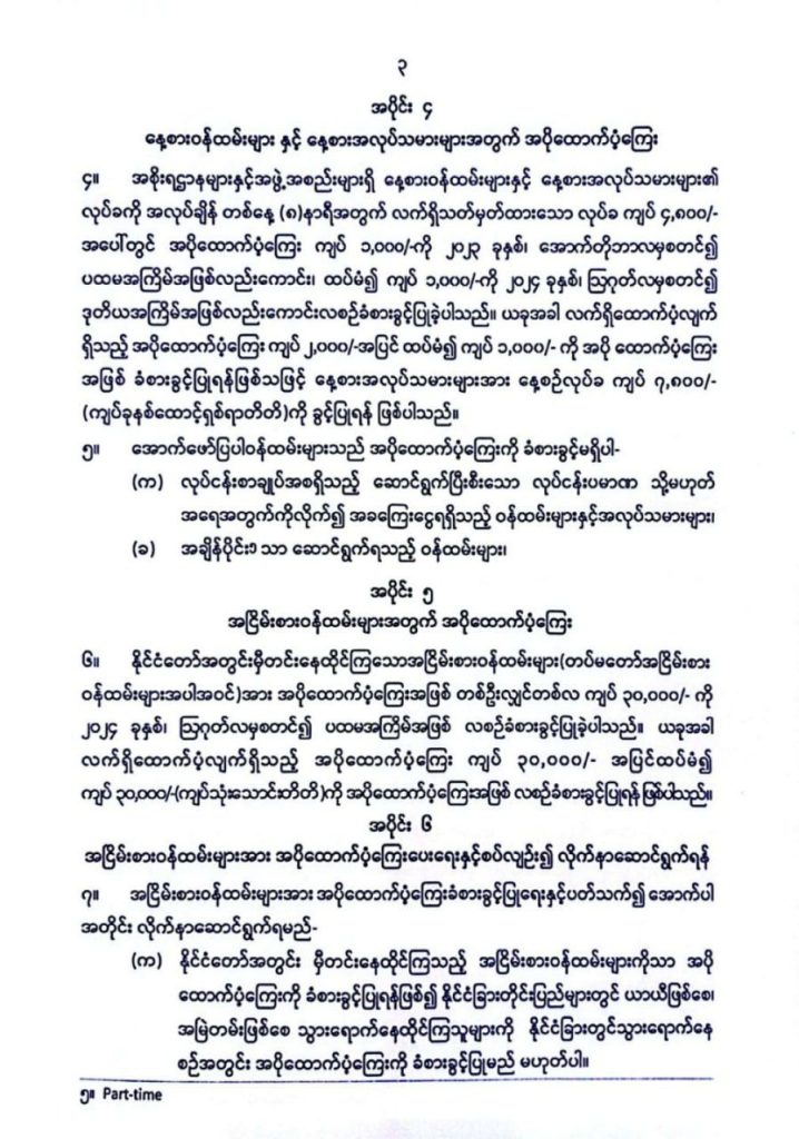 နေ့စားဝန်ထမ်းများနှင့် နေ့စားအလုပ်သမားများအတွက် အပိုထောက်ပံ့ကြေးအဖြစ် လက်ရှိထောက်ပံ့လျက်ရှိသည့် အပိုထောက်ပံ့ကြေး ကျပ် ၂,၀၀၀ အပြင် ထပ်မံ၍ ကျပ် ၁,၀၀၀ ကို အပိုထောက်ပံ့ကြေး ကျပ် ၁,၀၀၀ ခံစားခွင့်ပြုရန်ဖြစ်သည့်အတွက် နေ့စားအလုပ်သမားများအား နေ့စဉ်လုပ်ခ ကျပ် ၇,၈၀၀ တိတိကို ခွင့်ပြုရန်ဖြစ်ကြောင်း ထုတ်ပြန်ထားသည်။