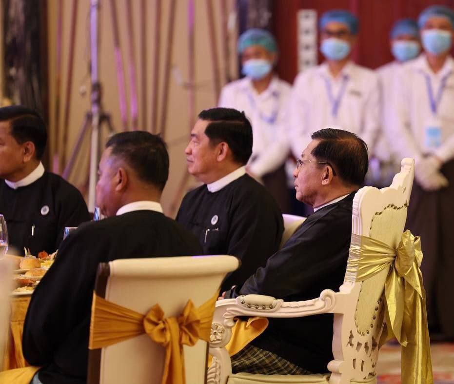 ယာယီသမ္မတ ဗိုလ်ချုပ်မှူးကြီးမင်းအောင်လှိုင်နှင့်ဇနီး၊ အခမ်းအနားတက်ရောက်လာကြသူများအား တာဝန်ရှိသူများက ကြိုဆိုနှုတ်ဆက်ခဲ့ကြပြီးနောက် ယာယီသမ္မတ ဗိုလ်ချုပ်မှူးကြီးမင်းအောင်လှိုင်နှင့်ဇနီး၊ အခမ်းအနားတက်ရောက်လာကြသူများသည် ဂုဏ်ပြုညစာကို အတူတကွသုံးဆောင်ကြသည်။