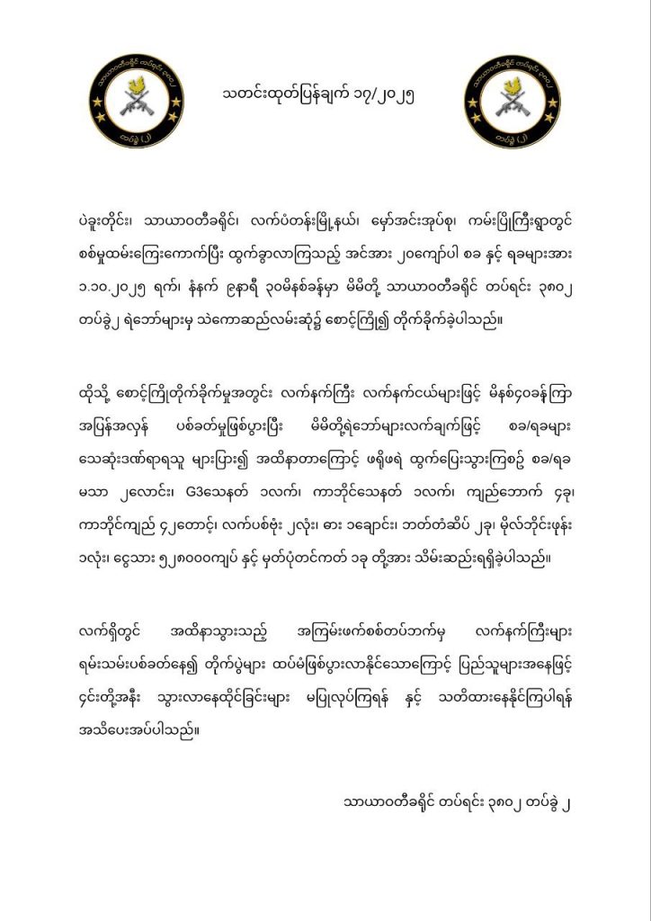 ထိုသို့ စောင့်ကြိုတိုက်ခိုက်မှုအတွင်း လက်နက်ကြီး လက်နက်ငယ်များဖြင့် မိနစ် ၄၀ ခန့်ကြာ အပြန်အလှန် ပစ်ခတ်မှုဖြစ်ပွားပြီး တိုက်ပွဲအတွင်း လုံခြုံရေးတပ်ဖွဲ့ဝင်နှစ်ဦး၏ အလောင်း၊ G 3 သေနတ် ၁ လက်၊ ကာဘိုင်သေနတ် ၁ လက်၊ ကျည်ဘောက် ၄ ခု၊ ကာဘိုင်ကျည် ၄၂ တောင့်၊ လက်ပစ်ဗုံး ၂ လုံး၊ ဓား ၁ ချောင်း၊ ဘတ်တံဆိပ် ၂ ခု၊ မိုလ်ဘိုင်းဖုန်း ၁ လုံး၊ ငွေသား ၅၂၈၀၀၀ ကျပ်နှင့် မှတ်ပုံတင်ကတ် ၁ ခု တို့အား သိမ်းဆည်းရရှိခဲ့သည်ဟုလည်း ထုတ်ပြန်ချက်တွင် ဖော်ပြထားသည်။