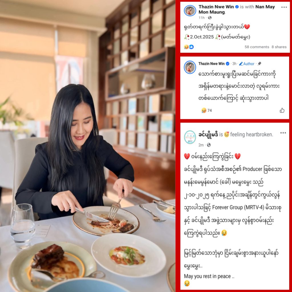 Forever Group ရဲ့ MRTV – 4 ရုပ်သံလိုင်းက ခင်ပျိုမဒီ အစီအစဥ်ထုတ်လုပ်သူ ပရိုဂျူဆာ နန်းမေမွန်မောင် (ခ) မွှေးမွှေးဟာ အောက်တိုဘာ ၂ ရက်ညက ကားလမ်းဖြတ်ကူးချိန် ကားဝင်တိုက်မိ သေဆုံးခဲ့တာနဲ့ ပတ်သက်ပြီး ပြည်ထဲရေးဝန်ကြီးဌာနက ထုတ်ပြန်ရာမှာ အောက်တိုဘာ ၂ ရက် ည ၁၀ နာရီအချိန် ရန်ကင်းမြို့နယ်၊ ကမ္ဘာအေးဘုရားလမ်း၊ ချော်တွင်းကုန်းမှတ်တိုင်အနီးယာဉ်တိုက်မှုဖြစ်ပွားကြောင်း သတင်းအရ အမှတ်(၆)ယာဉ်ထိန်းရဲ ဒုတပ်ဖွဲ့ခွဲမှ တပ်ဖွဲ့ဝင်များက သွားရောက်စစ်ဆေးခဲ့ရာ သင်္ဃန်ကျွန်းမြို့နယ်၊ ကြီးပွားရေးရပ်ကွက်နေ သက်ထွန်းနောင် (၄၂)နှစ် မောင်းနှင်လာသော BGO-27 7S-XXXX GAC TOYOTA BZ4X EV အဖြူရောင်ယာဉ်သည် ကမ္ဘာအေးဘုရားလမ်းအတိုင်း တောင်ဘက်မှ မြောက်ဘက်သို့ မောင်းနှင်လာစဉ် ချော်တွင်း ကုန်း မှတ်တိုင်အနီးအရောက် လမ်းဖြတ်ကူးသည့် မရမ်းကုန်းမြို့နယ်၊ (၉)ရပ်ကွက်နေ မနန်းမေမွန် မောင် (၃၈)နှစ်အား အရှိန်မထိန်းနိုင်ဘဲ ဝင်ရောက်တိုက်မိခဲ့သဖြင့် မနန်းမေမွန်မောင်မှာ ဒဏ်ရာများ ရရှိကာ သေဆုံးခဲ့သောကြောင့် သက်ထွန်းနောင်အား ရန်ကင်းမြို့မရဲစခန်းက ယာဉ်(ပ) ၈/၂၀၂၅၊ ရာဇသတ်ကြီး ပုဒ်မ ၃၀၄-က/ ၂၇၉ နဲ့ အမှုဖွင့် အရေးယူထားတယ်လို့ ဖော်ပြထားပါတယ်။
