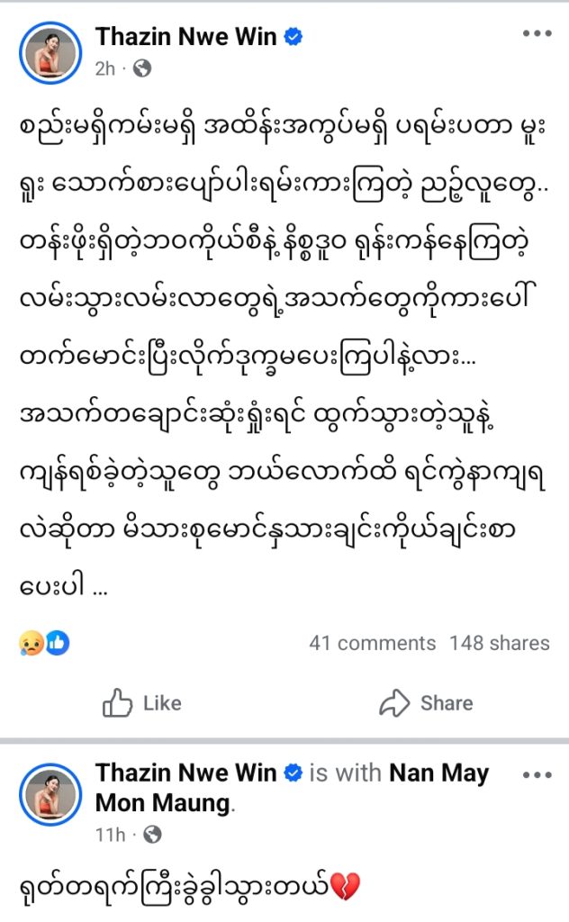 မမွှေးမွှေး ကားတိုက်ခံရတဲ့ဖြစ်စဥ်အပေါ် MRTV – 4 ရဲ့ နာမည်ကျော် အစီအစဥ်တင်ဆက်သူ သဇင်နွယ်ဝင်းက မနန်းမေမွန်မောင် အကောင့်ကို Tag တွဲပြီး ဝမ်းနည်းစကားဆိုထားသလို “စည်းမရှိကမ်းမရှိ အထိန်းအကွပ်မရှိ ပရမ်းပတာ မူးရူး သောက်စားပျော်ပါးရမ်းကားကြတဲ့ ညဉ့်လူတွေ..တန်ဖိုးရှိတဲ့ဘဝကိုယ်စီနဲ့ နိစ္စဒူဝ ရုန်းကန်နေကြတဲ့ လမ်းသွားလမ်းလာတွေရဲ့အသက်တွေကို ကားပေါ်တက်မောင်းပြီး လိုက်ဒုက္ခမပေးကြပါနဲ့လား… အသက်တစ်ချောင်းဆုံးရှုံးရင် ထွက်သွားတဲ့သူနဲ့ ကျန်ရစ်ခဲ့တဲ့သူတွေ ဘယ်လောက်ထိ ရင်ကွဲနာကျရလဲဆိုတာ မိသားစုမောင်နှသားချင်းကိုယ်ချင်းစာပေးပါ …” လို့လည်း ထပ်မံရေးသားထားပါတယ်။