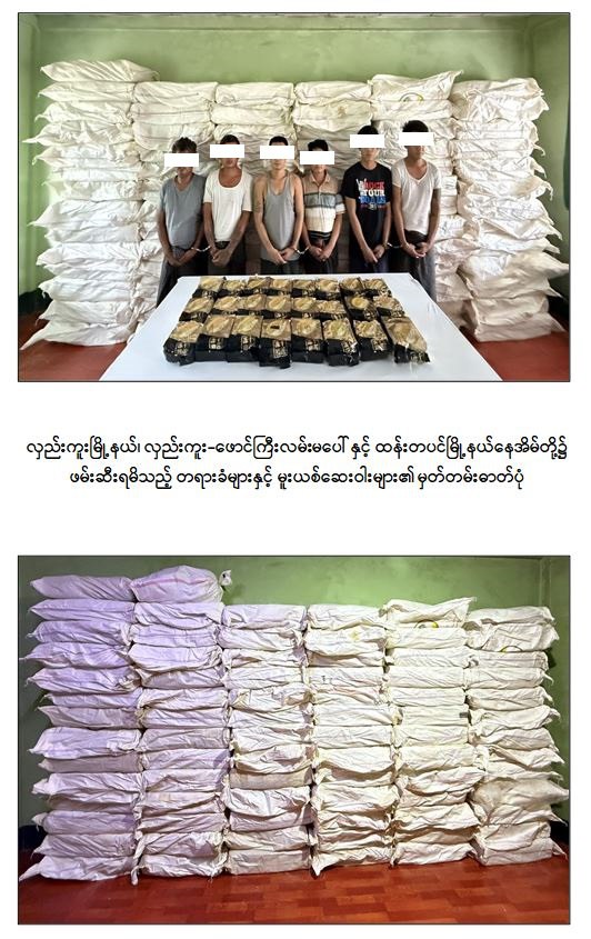 သို့ဖြစ်၍ မူးယစ်ဆေးဝါးသယ်ဆောင် ရောင်းဝယ်ခြင်းနှင့် အကြမ်းဖက်လုပ်ရပ်များကို မလိုလားသည့် ဒေသခံပြည်သူများ၏ သတင်းပေးပို့ချက်အရ ၂၀၂၅ ခုနှစ်၊ စက်တင်ဘာ ၂၄ ရက်တွင် ရှမ်းပြည်နယ်မှ မူးယစ်ဆေးဝါးများအား ရန်ကုန်မြို့မှတစ်ဆင့် ရခိုင်ပြည်နယ်နှင့် မလေးရှားနိုင်ငံသို့ ပို့ဆောင်မည်ဖြစ်ကြောင်း သိရှိရသဖြင့် လုံခြုံရေးတပ်ဖွဲ့ဝင်များက ပိတ်ဆို့ရှာဖွေစစ်ဆေးခဲ့ရာ လှည်းကူးမြို့နယ်၊ လှည်းကူး-ဖောင်ကြီးလမ်းမပေါ်၌ ယာဉ်မောင်း အောင်ခန့်ကျော် နှင့် ယာဉ်နောက်လိုက် ထက်ဝေဖြိုး တို့ကို ၎င်းတို့မောင်းနှင်လာသည့် NISSAN CONDOR ယာဉ်ပေါ်မှ အိုက်စ် ၁၄၃၉ ကီလိုဂရမ်၊ တန်ဖိုးငွေကျပ် ၃၅ ဒသမ ၉၇ ဘီလျံခန့်နှင့်အတူ ဖမ်းဆီးရမိခဲ့ပြီး ၎င်းတို့ ၂ ဦး၏ ထွက်ဆိုချက်အရ စက်တင်ဘာ ၂၅ ရက်တွင် ရွှေပြည်သာမြို့နယ်၊ ဒညင်းကုန်း လမ်းဆုံအနီးရှိ “ရွှေမောင်း”လက်ဖက်ရည်ဆိုင်၌ မူးယစ်ဆေးဝါး သယ်ဆောင်မည့်ယာဉ်အား ငှားရမ်းချိတ်ဆက် ပေးသည့် ဇော်ဝင်းထွန်း နှင့် ဆန်းထွန်းကျော် တို့ ၂ ဦး အားလည်းကောင်း၊ ထန်းတပင်မြို့နယ်၊ စည်ပင်သာကျေးရွာရှိ နေအိမ်၌ မူးယစ်ဆေးဝါးများ သိုလှောင်သိမ်းဆည်းပေးသူ ဇော်လင်း၊ စောဇင်မင်းဟန် တို့ကို အိုက်စ် ၁၉၉၉ ကီလိုဂရမ်၊ တန်ဖိုးငွေကျပ် ၄၉ ဒသမ ၉၇ ဘီလျံခန့်နှင့်အတူ လည်းကောင်း ထပ်မံဖမ်းဆီးရမိခဲ့ကြောင်း သိရှိရသည်။