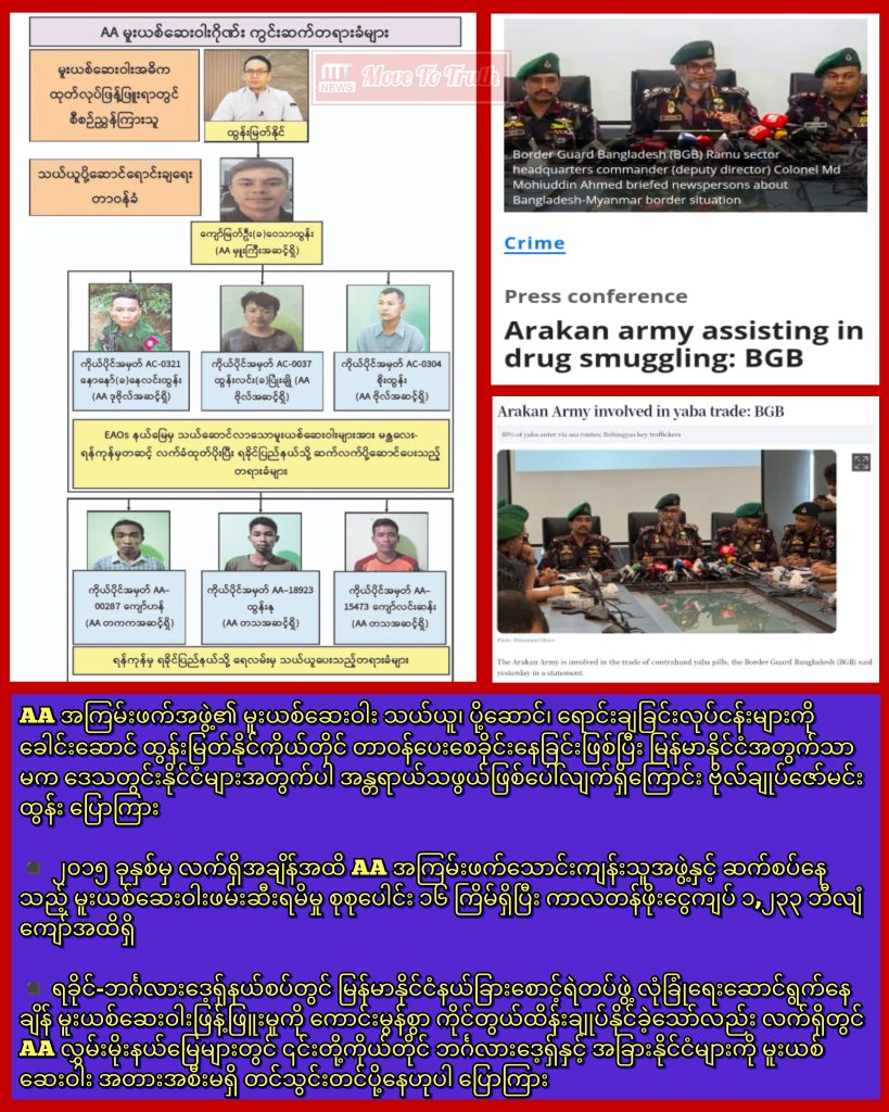 “AA အကြမ်းဖက်သောင်းကျန်းသူအဖွဲ့ ခေါင်းဆောင် ထွန်းမြတ်နိုင်ကိုယ်တိုင်က တာဝန်ပေးစေခိုင်းတဲ့အတွက် ဒီမူးယစ်ဆေးဝါး သယ်ဆောင်ဖြန့်ဖြူးရောင်းချတဲ့ လုပ်ငန်းတွေကို လုပ်နေရတာဖြစ်ကြောင်းကို ဖမ်းဆီးရမိတဲ့ AA အကြမ်းဖက်သောင်းကျန်းသူအဖွဲ့ဝင်တွေက ထွက်ဆိုချက်တွေမှာ တွေ့နိုင်ပါတယ်။ AA အကြမ်းဖက်သောင်းကျန်းသူအဖွဲ့က ၂၀၁၅ ခုနှစ်မှာတစ်ကြိမ်ဖမ်းမိခဲ့တဲ့ ကာလတန်ဖိုးငွေကျပ် ၁ ဒသမ ၆၅ ဘီလျံခန့်နဲ့ ၂၀၁၉ ခုနှစ်မှာ လေးကြိမ် ကာလတန်ဖိုးငွေကျပ် ၅၉ ဘီလျံခန့်၊ ၂၀၂၀ ခုနှစ်မှာ တစ်ကြိမ် ကာလတန်ဖိုးငွေကျပ် ၁၀ ဘီလျံ၊ ၂၀၂၃ ခုနှစ်မှာတစ်ကြိမ် ကာတန်ဖိုးငွေကျပ် ၁၅၅ ဒသမ ၈၇ ဘီလျံ၊ ၂၀၂၄ ခုနှစ်မှာ နှစ်ကြိမ် ကာလတန်ဖိုးငွေကျပ် ၃ ဒသမ ၂၂ ဘီလျံခန့်နဲ့ ယခု ၂၀၂၅ ခုနှစ်အတွင်းမှာ ခြောက်ကြိမ် ကာလတန်ဖိုးငွေကျပ် ၁၀၀၉ ဒသမ ၉၃ ဘီလျံခန့်ဖြစ်ပြီး ၂၀၁၅ ခုနှစ်ကနေ အခုချိန်အထိ AA အကြမ်းဖက်သောင်းကျန်းသူအဖွဲ့နဲ့ ဆက်စပ်နေတဲ့ မူးယစ်ဆေးဝါးဖမ်းဆီးရမိမှု စုစုပေါင်း ၁၆ ကြိမ်တိတိရှိခဲ့ပါတယ်။ စုစုပေါင်းကာလတန်ဖိုးငွေကျပ် ၁၂၃၃ ဒသမ ၆၇ ဘီလျံအထိ ဖမ်းဆီးရမိခဲ့ပါတယ်။ ဒီပမာဏကိုကြည့်ရင် ဘယ်လောက်အန္တရာယ်များကြောင်း တွေ့နိုင်မှာဖြစ်ပါတယ်။ AA အကြမ်းဖက်သောင်းကျန်းသူအဖွဲ့အနေနဲ့ ရခိုင်ပြည်နယ်မှာ သူတို့ထိန်းချုပ်ထားတဲ့နေရာတွေကနေတစ်ဆင့် ဒေသတွင်းနေရာများကို ဘယ်လောက်အထိ မူးယစ်ဆေးဝါးတွေ ပို့ဆောင်နေခဲ့ကြောင်း ထင်းရှားစွာတွေ့ရမှာဖြစ်ပါတယ်” ဟု ဗိုလ်ချုပ်ဇော်မင်းထွန်းက ပြောကြားသည်။
