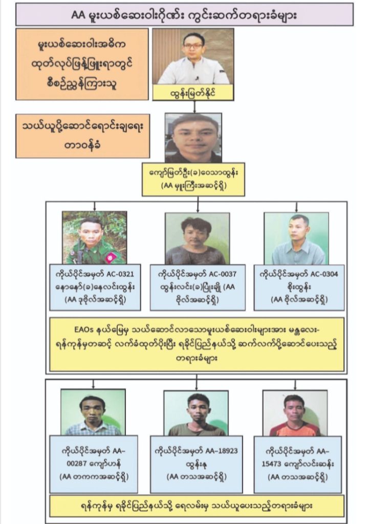“သူတို့ကို ကျွန်တော်တို့ စနစ်ကျစစ်ဆေးဖော်ထုတ်တဲ့အခါမှာ AA သောင်းကျန်းသူအဖွဲ့ ခေါင်းဆောင် ထွန်းမြတ်နိုင်ရဲ့ တာဝန်ပေးချက်အရ AA သောင်းကျန်းသူ ဗိုလ်မှူးကြီးအဆင့်ရှိ ကျော်မြတ်ဦး(ခ) သားသား(ခ) ဝေသာထွန်းက ဦးစီးပြီး စီမံခန့်ခွဲလုပ်ဆောင်နေကြောင်း ထွက်ဆိုချက်တွေအရ တိကျစွာသိရှိရပါတယ်” ဟု ဗိုလ်ချုပ်ဇော်မင်းထွန်းက ပြောကြားသည်။