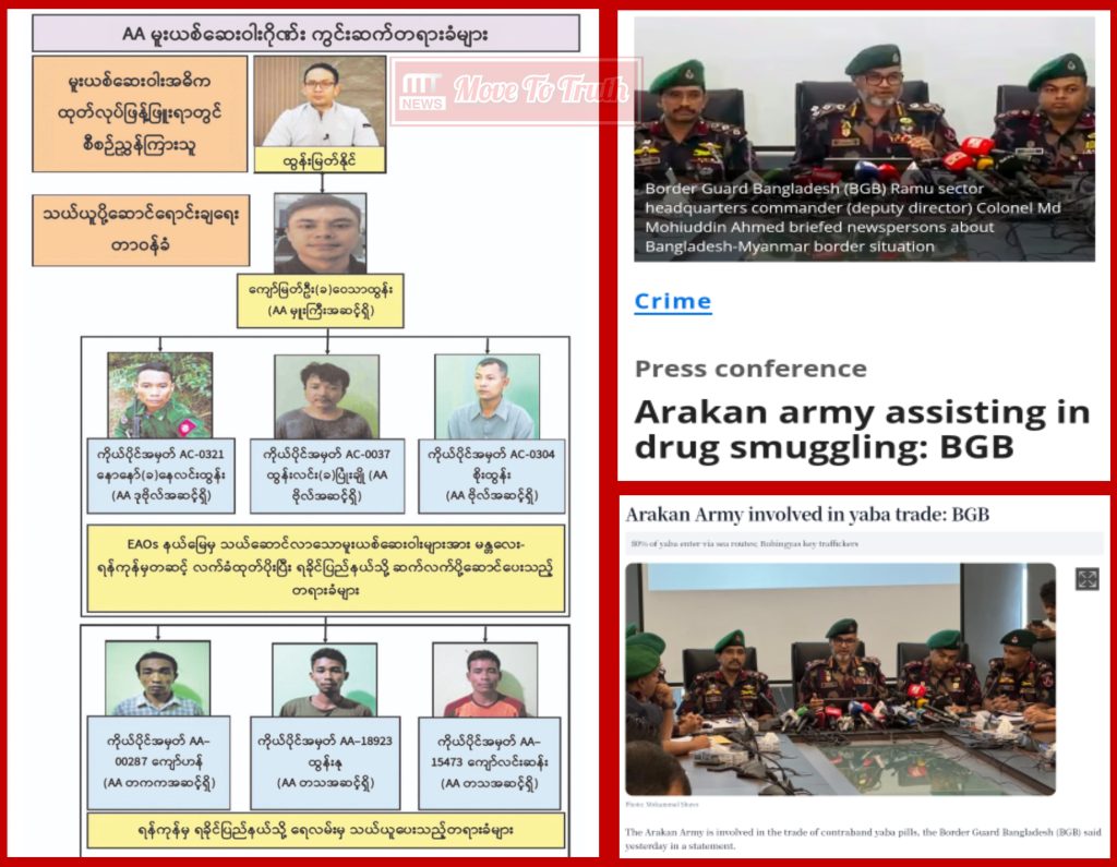 “ဒါတွေကို ဘင်္ဂလားဒေ့ရှ်နယ်ခြားစောင့်တပ် (BGB)ရဲ့ ရာမူးစစ်ဌာနချုပ်မှူးကိုယ်တိုင် စက်တင်ဘာလ ၁၅ ရက်နေ့ သတင်းစာရှင်းလင်းပွဲမှာ ပြောကြားခဲ့တာကိုလည်းတွေ့ရပါတယ်။ ယခင်ကတော့ ဒီရခိုင်-ဘင်္ဂလားဒေ့ရှ်နယ်စပ်မှာ မြန်မာနိုင်ငံရဲ့ နယ်ခြားစောင့်ရဲတပ်ဖွဲ့တွေ လုံခြုံရေးဆောင်ရွက်နေတဲ့အခြေအနေမှာ ဒီလိုကိစ္စတွေကို ကောင်းမွန်စွာ ကိုင်တွယ်ထိန်းချုပ်နိုင်ခဲ့ပါတယ်။ ယခုကတော့ သူတို့လွှမ်းမိုးနေတဲ့ နယ်မြေမှာ AA သောင်းကျန်းသူတပ်ဖွဲ့တွေကိုယ်တိုင် ဘင်္ဂလားဒေ့ရှ်နိုင်ငံနဲ့ အခြားနိုင်ငံတွေကို မူးယစ်ဆေးဝါးတွေကို အတားအစီးမဲ့စွာ တင်သွင်း၊ တင်ပို့နေကြောင်း တွေ့ရတာဖြစ်ပါတယ်။ ဒီလိုပို့ဆောင်ဖြန့်ဖြူးရရှိတဲ့ ငွေတွေကနေတစ်ဆင့် ရိက္ခာ၊ လက်နက်၊ ခဲယမ်းတွေ ဝယ်ယူနေခြင်းဖြစ်ကြောင်းလည်း တွေ့ရှိရပါတယ်” ဟု ဗိုလ်ချုပ်ဇော်မင်းထွန်းက ပြောကြားသည်။