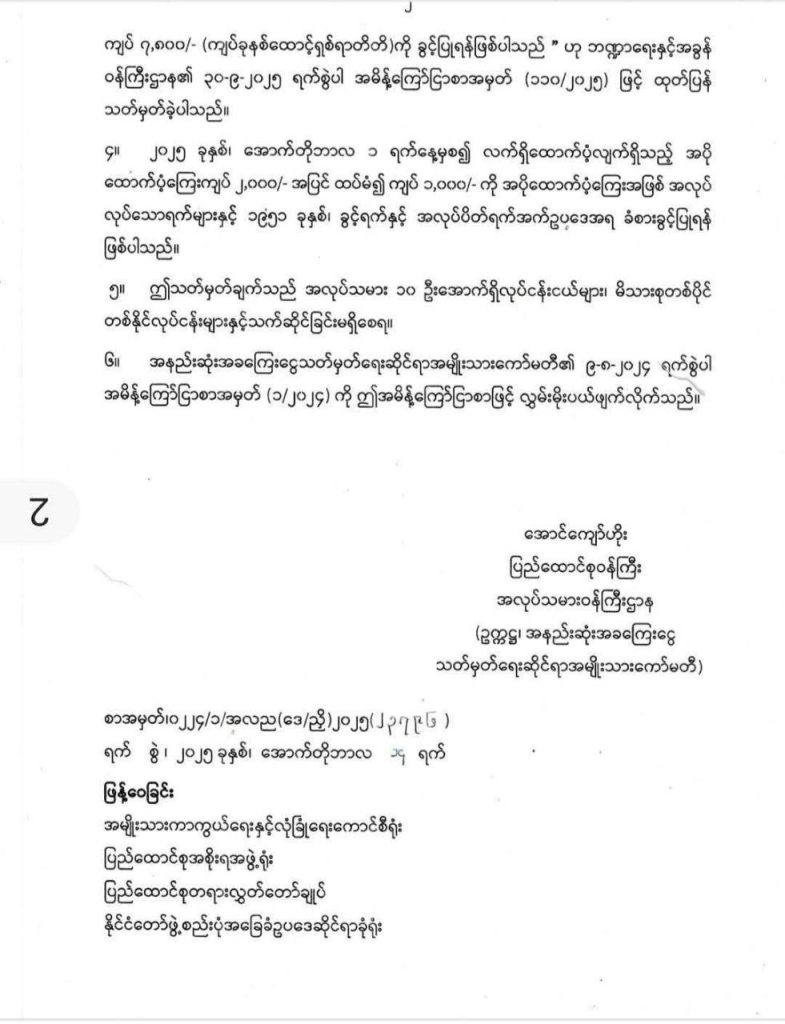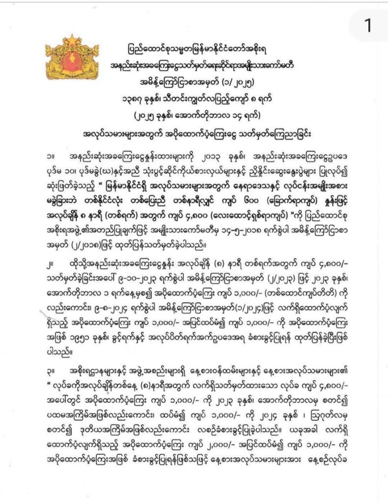 အစိုးရဌာနများနှင့် အဖွဲ့အစည်းများရှိ နေ့စားဝန်ထမ်းများနှင့် နေ့စားအလုပ်သမားများ၏ “ လုပ်ခကိုအလုပ်ချိန်တစ်နေ့ ၈ နာရီအတွက် လက်ရှိသတ်မှတ်ထားသော လုပ်ခ ကျပ် ၄,၈၀၀ အပေါ်တွင် အပိုထောက်ပံ့ကြေး ကျပ် ၁,၀၀၀ ကို ၂၀၂၃ ခုနှစ်၊ အောက်တိုဘာလမှ စတင်၍ ပထမအကြိမ်အဖြစ်လည်းကောင်း၊ ထပ်မံ၍ ကျပ် ၁,၀၀၀ ကို ၂၀၂၄ ခုနှစ် ၊ ဩဂုတ်လမှ စတင်၍ ဒုတိယအကြိမ်အဖြစ်လည်းကောင်း လစဉ်ခံစားခွင့်ပြုခဲ့သည်။