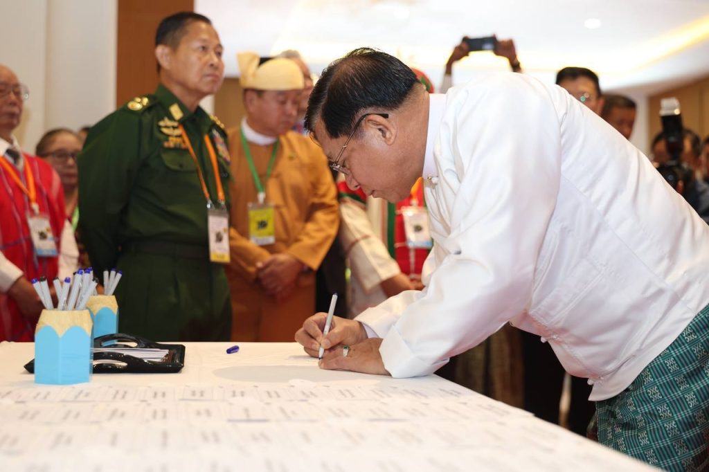 “လိုအပ်တဲ့ တိုင်းရင်းသား အခွင့်အရေးများ နိုင်ငံရေးတောင်းဆိုမှုများအရ ပြင်ဆင်ဖို့ လိုအပ်တာတွေကိုလည်း ဖွဲ့စည်းပုံအခြေခံဥပဒေနဲ့အညီ နိုင်ငံတော်အစိုးရက ပြင်ဆင်ဆောင်ရွက်ပေးသွားမှာလည်းဖြစ်ပါတယ်။ ကျွန်တော့်အနေနဲ့ ဒီမိုကရေစီနဲ့ ဖက်ဒရယ်စနစ်ကို အခြေခံတဲ့ ပြည်ထောင်စုတည်ဆောက်ရေးအတွက် ခိုင်ခိုင်မာမာရပ်တည်ပြီး မမှိတ်မသုန်ဆောင်ရွက်သွားမှာဖြစ်ကြောင်းကိုလည်း ထပ်လောင်း ပြောကြားလိုပါတယ်” ဟု ယာယီသမ္မတက ဆက်လက် ပြောကြားသည်။