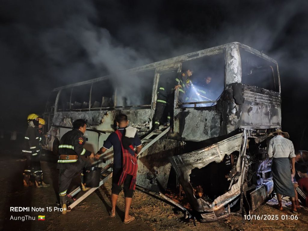 အဆိုပါ ယာဉ်ပေါ်မှာ ယာဉ်မောင်းအပါအဝင် အမျိုးသား (၁၀)ဦး၊ အမျိုးသမီး (၅)ဦးလိုက်ပါလာပြီး ယာဉ်မီးလောင်မှုကြောင့် ယာဉ်မောင်းနဲ့ ယာဉ်ပေါ်ပါသူတွေ ထိခိုက်ဒဏ်ရာရရှိမှုမရှိခဲ့ပေမယ့် ယာဉ်ကတော့ တစ်စီးလုံးမီးလောင်ကျွမ်းခဲ့ရာ အောက်တိုဘာ ၁၆ ရက်နေ့အကူး ၁၂ နာရီ ၅၀ မိနစ်အချိန်ခန့်မှာမှ သာဂရအမြန်လမ်းမကြီး မီးသတ်စခန်းမှ တပ်ဖွဲ့ဝင်တွေက မီးသတ်ယာဉ်နှစ်စီးဖြင့် မီးငြိမ်းသတ်မှုကြောင့် မီးညွန့်ကျိုးကာ မီးလောင်ကျွမ်းမှုပြီးဆုံးခဲ့တယ်လို့ သိရပါတယ်။