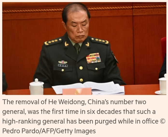 ရှီသည် ဗဟိုစစ်ကော်မရှင် (Central Military Commission – CMC) ၏ ဒုတိယဥက္ကဋ္ဌ နှစ်ဦးအနက်မှ နံပါတ် ၂ ခေါင်းဆောင်ဖြစ်သူ ဗိုလ်ချုပ် ဟယ်ဝေတုန်း (General He Weidong) ကို ရာထူးမှ တရားဝင် ထုတ်ပယ်ခဲ့သည်။