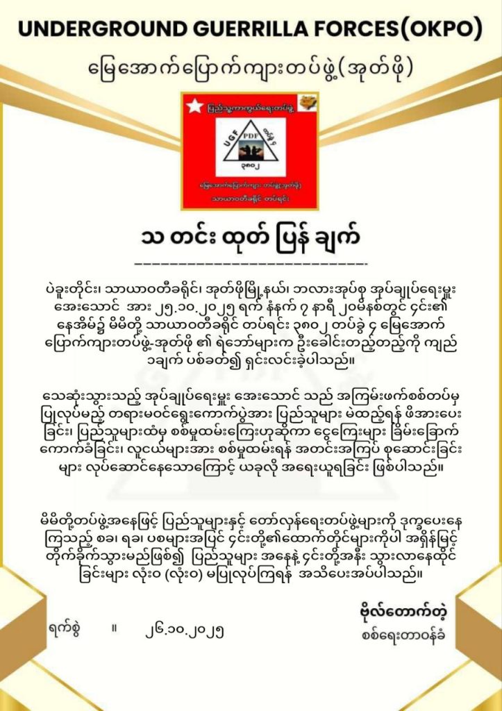 ပဲခူးတိုင်း၊ သာယာဝတီခရိုင်၊ အုတ်ဖိုမြို့နယ်၊ ဘလားအုပ်စု အုပ်ချုပ်ရေးမှူး ဦးအေးသောင်အား အောက်တိုဘာ ၂၅ ရက် နံနက် ၇ နာရီ ၂၀မိနစ်တွင် ၎င်း၏နေအိမ်၌ပင် သာယာဝတီခရိုင် တပ်ရင်း ၃၈၀၂ တပ်ခွဲ ၄ မြေအောက်ပြောက်ကျားတပ်ဖွဲ့-အုတ်ဖို၏ PDF များက ဦးခေါင်းတည့်တည့်ကို ကျည် ၁ ချက် ပစ်ခတ်၍ သတ်ဖြတ်ခဲ့သည်ဟုလည်း ဝန်ခံဖော်ပြထားသည်။