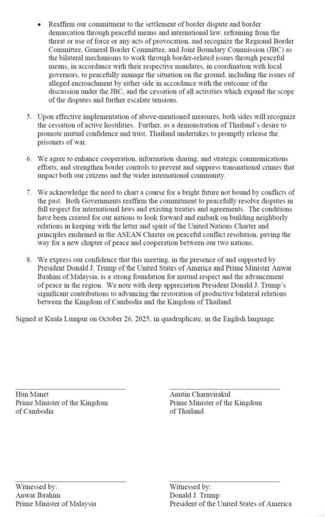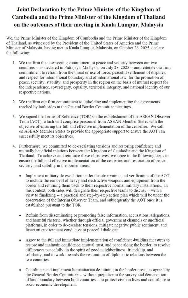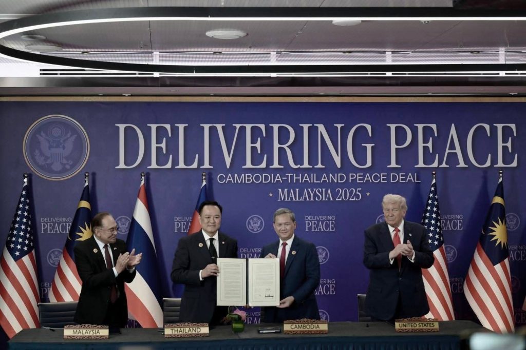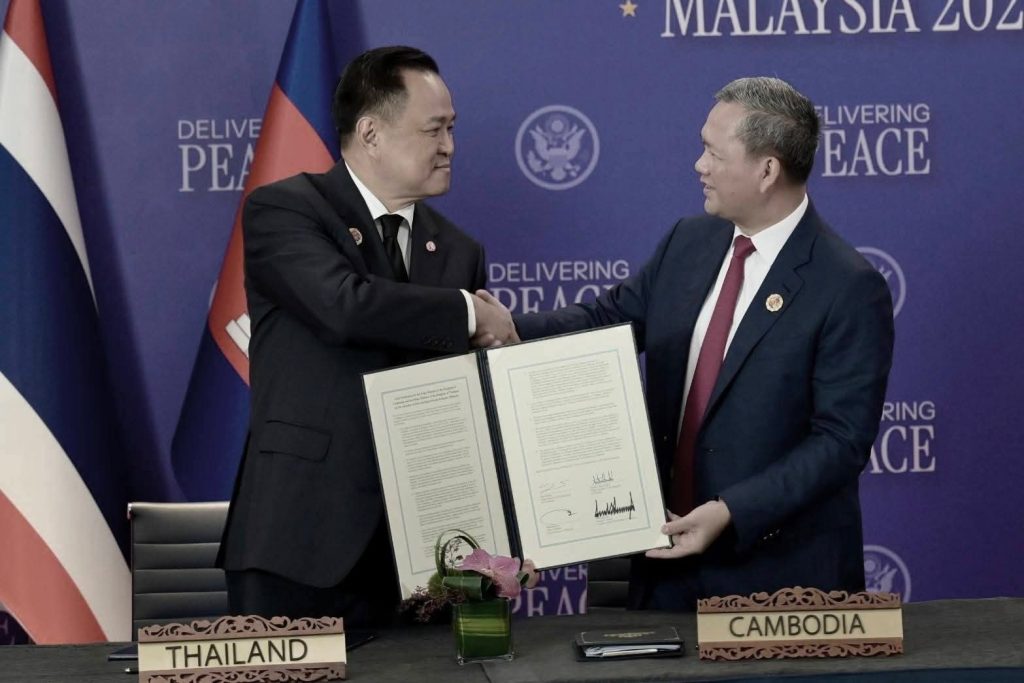 ထိုင်းနိုင်ငံနှင့် ကမ္ဘောဒီးယားနိုင်ငံတို့သည် မလေးရှားနိုင်ငံ၏ မြို့တော် ကွာလာလမ်ပူတွင် ယနေ့စတင် ကျင်းပသည့် အာဆီယံထိပ်သီးအစည်းအဝေးအတွင်း အာဆီယံ ဥက္ကဋ္ဌနှင့် မလေးရှားဝန်ကြီးချုပ် အန်နဝါ အီဘရာဟင်၏ ကြားဝင်စေ့စပ်မှုအပြင် အမေရိကန်သမ္မတ ဒေါ်နယ်ဒ် ထရမ့်ပ်ကပါ သက်သေအဖြစ် ပါဝင် ဆောင်ရွက်မှုဖြင့် ငြိမ်းချမ်းရေးသဘောတူညီချက်အသစ်ကို လက်မှတ်ရေးထိုးခဲ့ကြသည်။