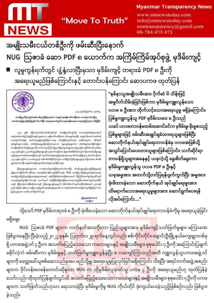 ပြီးခဲ့သည့် ၂၀၂၃ ခုနှစ်ကလည်း NUG ဩဇာခံ ဆောမြို့နယ် PDF များက အမျိုးသမီးတစ်ဦးကို ခိုးမှုကျုးလွန်သည်စွပ်စွဲကာ အချုပ်ခန်းတွင် ဖမ်းဆီးပြီးနောက် ဆော PDF ၈ ဦးက အကြိမ်ကြိမ်အုပ်စုဖွဲ့ မုဒိမ်းကျင့်မှုဖြစ်ပွားခဲ့သည်။ ထိုဖြစ်စဉ်မှာ ဖြစ်ပွားပြီး လေးလအကြာ လူမှုကွန်ရက်တွင် ပျံ့နှံ့လာမှသာ PDF မုဒိမ်းတရားခံများကို အရေးယူမည်ဖြစ်ကြောင်းနှင့် တောင်းပန်ကြောင်းစာကို ဆောမြို့နယ် ပြည်သူ့ကာကွယ်ရေးတပ်ဖွဲ့(ဆောပကဖ) က ထုတ်ပြန်ပေးခဲ့သည်။