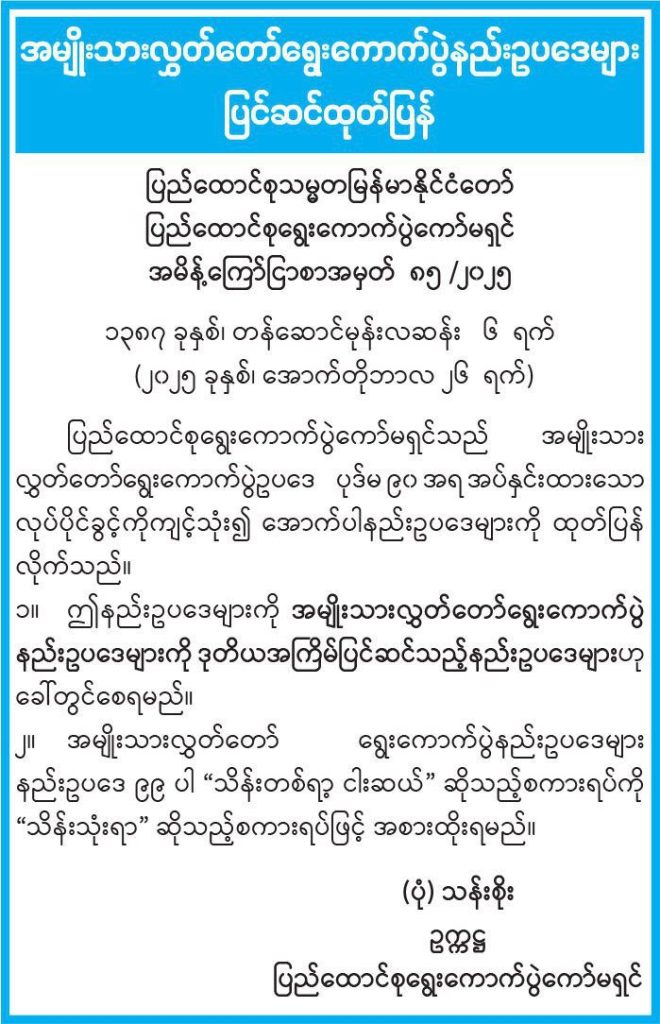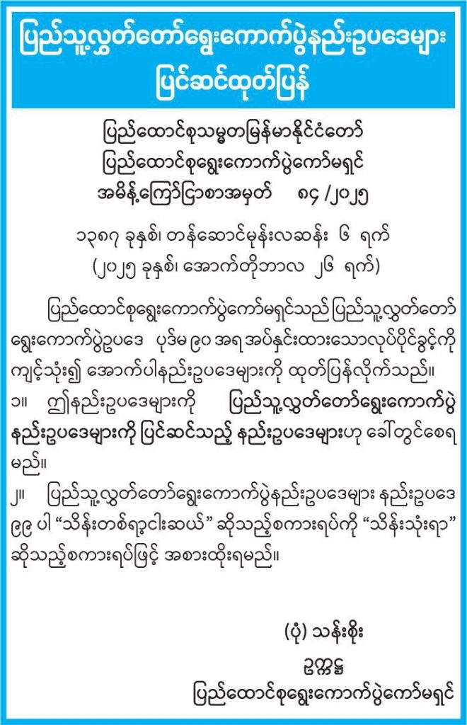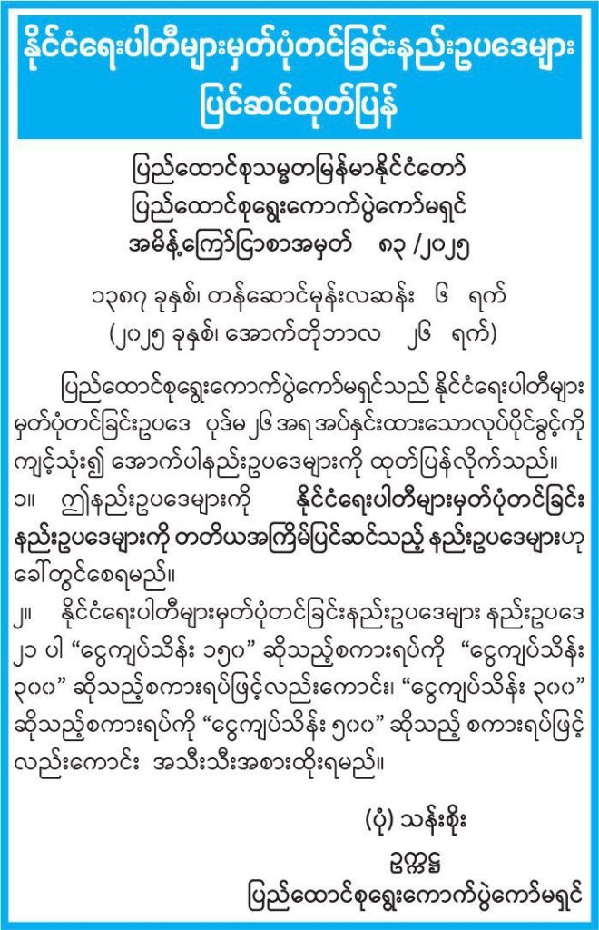 နိုင်ငံရေးပါတီများ မှတ်ပုံတင်ခြင်း နည်းဥပဒေကို တတိယအကြိမ်ပြင်ဆင်သည့်နည်းဥပဒေ ပြည်ထောင်စုရွေးကောက်ပွဲကော်မရှင်(UEC) က အောက်တိုဘာ ၂၆ ရက်တွင် အသိပေးထုတ်ပြန်လိုက်ပြီး အဆိုပါ ပြင်ဆင်ချက်အရ လွှတ်တော်ကိုယ်စားလှယ်လောင်းများသည် ရွေးကောက်ပွဲ မဲဆွယ်အသုံးစရိတ်များကို တိုးမြှင့်အသုံးပြုနိုင်မည်ဖြစ်သည်။