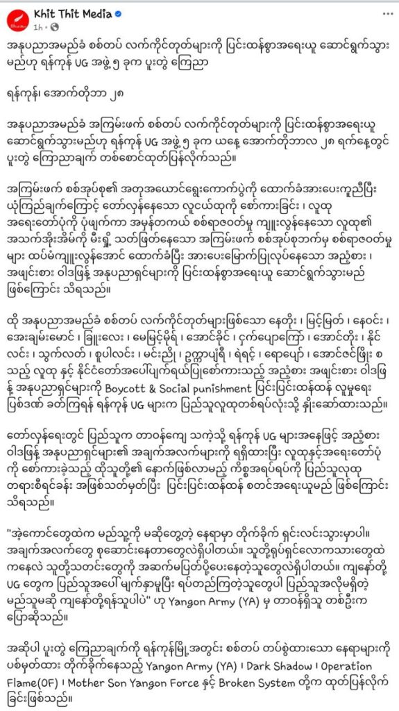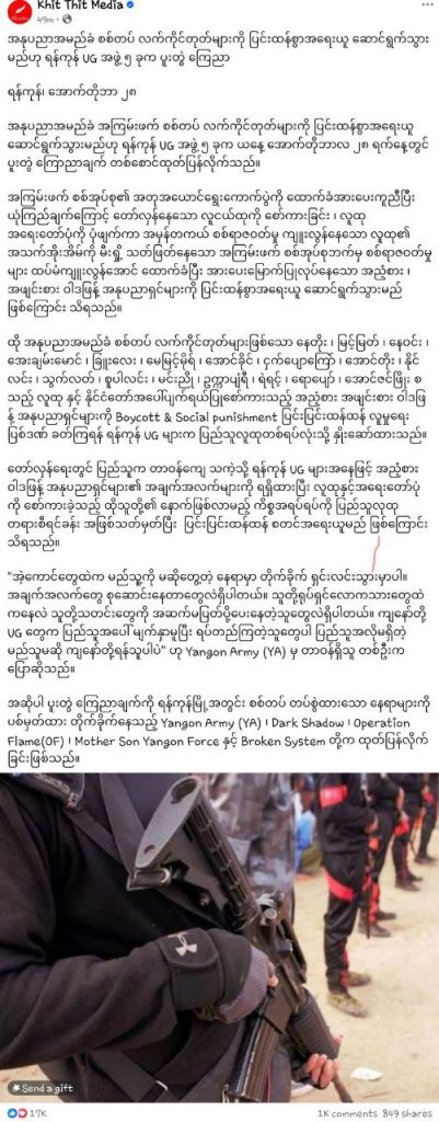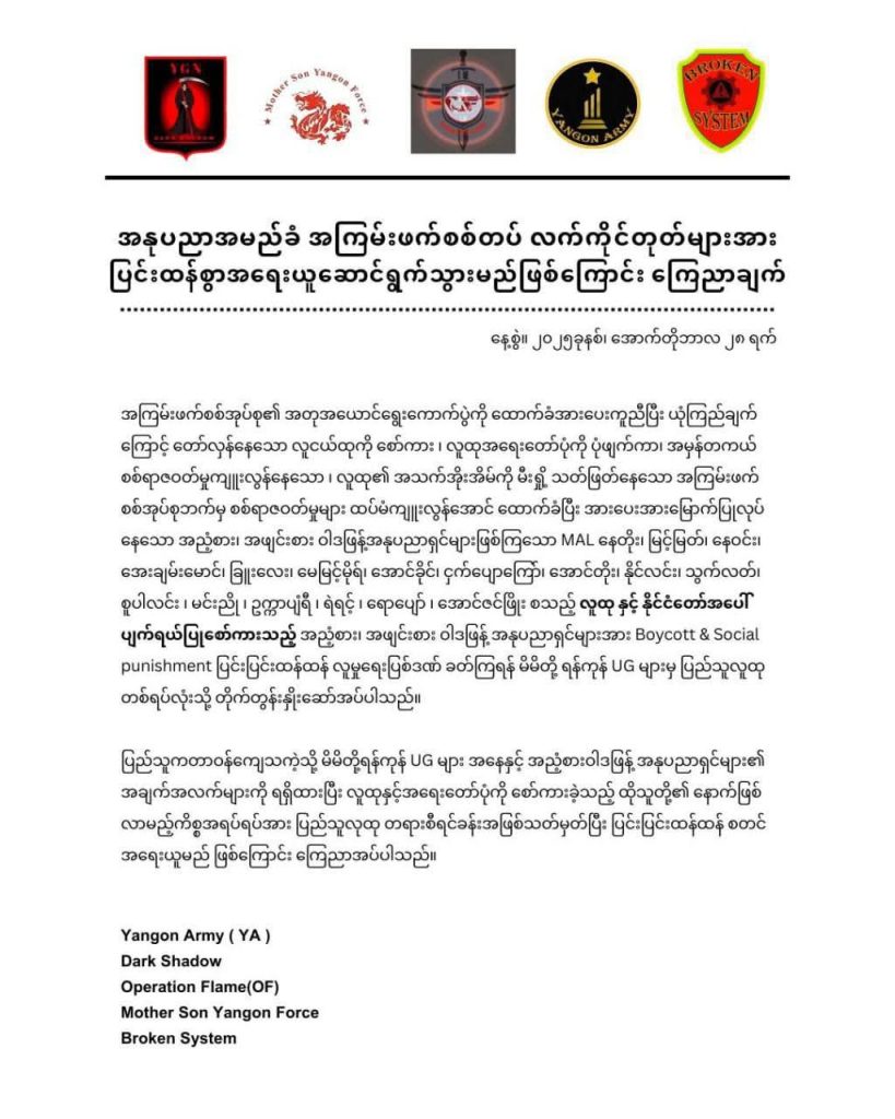အဆိုပါ အနုပညာရှင် ၁၇ ယောက်ကို သတ်ဖြတ်မည့်အစီအစဥ်ကို လုပ်ဆောင်မည့် PDF အဖွဲ့များမှာ Yangon Army၊ Dark Shadow၊ Operation Flame (OF) ၊ Mother Son Yangon Force နှင့် Broken System စသည့် PDF ငါးဖွဲ့ဖြစ်ပြီး ထိုသို့သတ်ဖြတ်မည့် ကြံရွယ်ချက်ကို ပြည်သူလုထု တရားစီရင်ခန်းအဖြစ်သတ်မှတ်ပြီး ပြင်းပြင်းထန်ထန် စတင် အရေးယူမည် ဖြစ်ကြောင်း ကြေညာအပ်ပါသည်ဟုလည်း ခြိမ်းခြောက်ထားသည်။