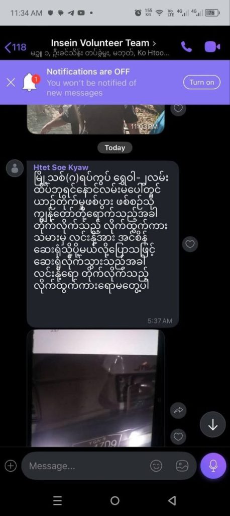 အင်းစိန်မြို့နယ် Volunteers Team မှ တာဝန်ရှိသူက “ကျွန်တော်တို့ဆီကို မနက်အစာပိုင်း ငါးနာရီဝန်းကျင်လောက်က ယာဉ်တိုက်မှုသတင်းဝင်လာတယ်။ ဖြစ်စဉ်နေရာကိုရောက်တော့ တိုက်တဲ့ ကားသမားက လူနာကိုတင်ပြီး ဆေးရုံပို့ပေးမယ်ဆိုပြီးခေါ်သွားတယ်လို့ မျက်မြင်တွေကပြောပြတယ်။ အဲ့ဒါနဲ့ ယာဉ်နံပါတ်တွေ ဘာတွေ သက်သေပေါ့ စုံစမ်းပြီး ရတာနဲ့ ကျွန်တော်တို့ အင်းစိန်ဆေးရုံ လိုက်သွားတယ်။ ဆေးရုံကို လာမပို့ဘူးလို့ သိရတော့ ကျွန်တော်တို့အသင်းအဖွဲ့တွေရဲ့ Viber Group မှာ ဖြစ်စဉ်ကို တင်လိုက်တယ်။ အဲ့ဒီမှာ ကိုသူရိန်တို့ (ကနောင် နာကူ/ရှင်ကူအသင်း) ဘက်က ဆက်သွယ်လာတာပါ။စက်မှုဇုန်ထဲမှာတွေ့ထားလို့ ဆေးရုံတင်ပို့ဖို့ ဆောင်ရွက်နေတယ်ဆိုပြီး” လို့ MT News က ဆက်သွယ်မေးမြန်းတာကို ပြန်လည်ဖြေကြားပါတယ်။