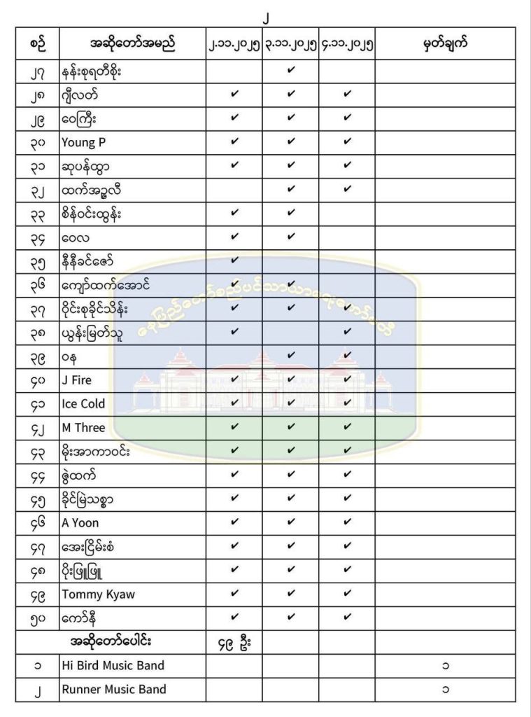 အထက်ပါ အဆိုတော်များအပြင် တစ်ခေတ်တစ်ခါက အောင်မြင်ခဲ့သော အဆိုတော်ကြီးများဖြစ်သည့် ကိုင်ဇာ၊ ရဲသွင်၊ ဖြိုးကြီး၊ ကော်နီ၊ စိန်ဝင်းထွန်း စသူတို့လည်း ပါဝင်ဖျော်ဖြေမည်ဖြစ်ကြောင်း သိရသည်။