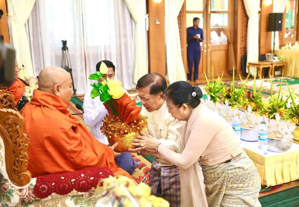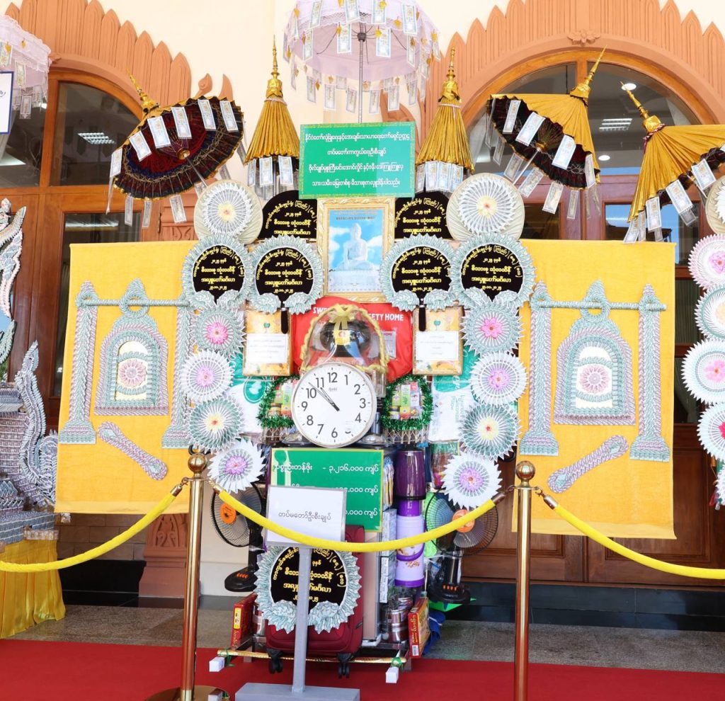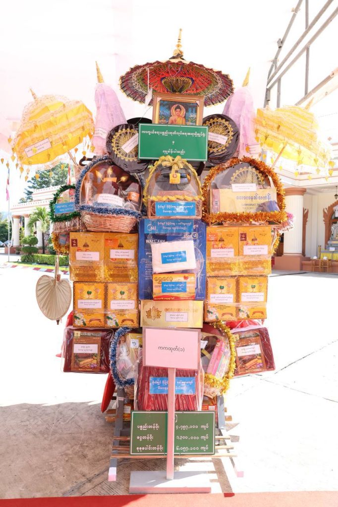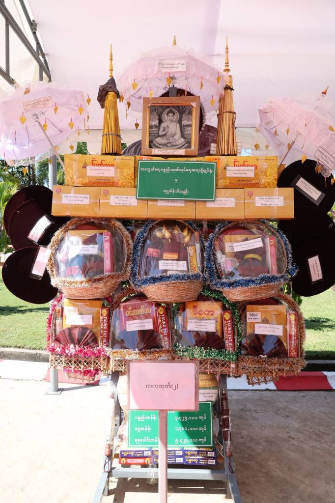 တပ်မတော်ကာကွယ်ရေးဦးစီးချုပ်နှင့်ဇနီး၊ ဧည့်ပရိသတ်များသည် ဘုန်းတော်ကြီးကျောင်း အသီးသီးသို့ လှူဒါန်းရန် ခင်းကျင်းပြင်ဆင်ထားသည့် ကထိန်လျာသင်္ကန်း၊ လှူဖွယ်ပစ္စည်းများနှင့် ပဒေသာပင်များအား လှည့်လည်ကြည့်ရှုကြပြီးနောက် တပ်မတော်ကာကွယ်ရေးဦးစီးချုပ်သည် အနော်ရထာခန်းမအတွင်းရှိ ဗုဒ္ဓရုပ်ပွားတော်မြတ်အား ဖူးမြော်ကြည်ညို၍ မြသပိတ်ဆွမ်းတော်နှင့် ပန်း၊ သောက်တော်ရေချမ်း၊ ဆီမီး၊ သစ်သီးတို့ကို ဆက်ကပ်လှူဒါန်းသည်။