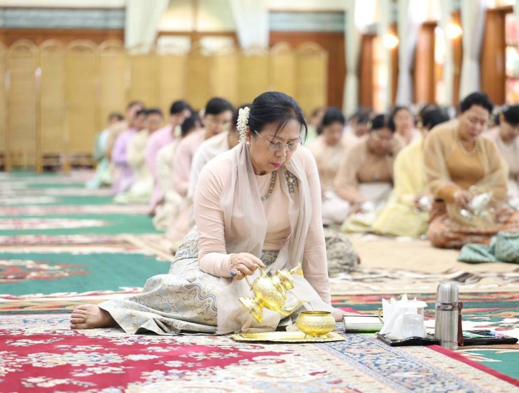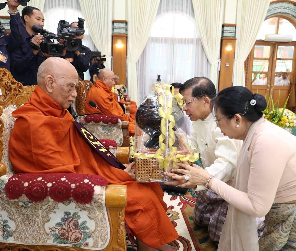 ကာကွယ်ရေးဦးစီးချုပ်ရုံး (ကြည်း၊ ရေ၊ လေ)မိသားစုများ၏ ၂၀၂၅ ခုနှစ် မဟာဘုံကထိန် အလှူတော်မင်္ဂလာ အခမ်းအနားကို ယနေ့ နံနက်ပိုင်းတွင် ကာကွယ်ရေး ဦးစီးချုပ်ရုံး (ကြည်း) အနော်ရထာခန်းမ၌ ဆင်ယင်ကျင်းပ ပြုလုပ်ရာ နိုင်ငံတော်လုံခြုံရေးနှင့် အေးချမ်းသာယာရေးကော်မရှင် ဥက္ကဋ္ဌ တပ်မတော်ကာကွယ်ရေး ဦးစီးချုပ် ဗိုလ်ချုပ်မှူးကြီး မင်းအောင်လှိုင်နှင့် ဇနီးဒေါ်ကြူကြူလှတို့ တက်ရောက်၍ ကထိန်လျာသင်္ကန်းနှင့် လှူဖွယ်ပစ္စည်းများ ဆက်ကပ်လှူဒါန်းသည်။