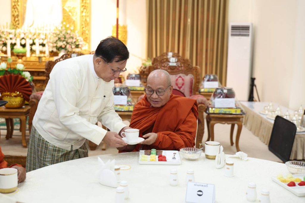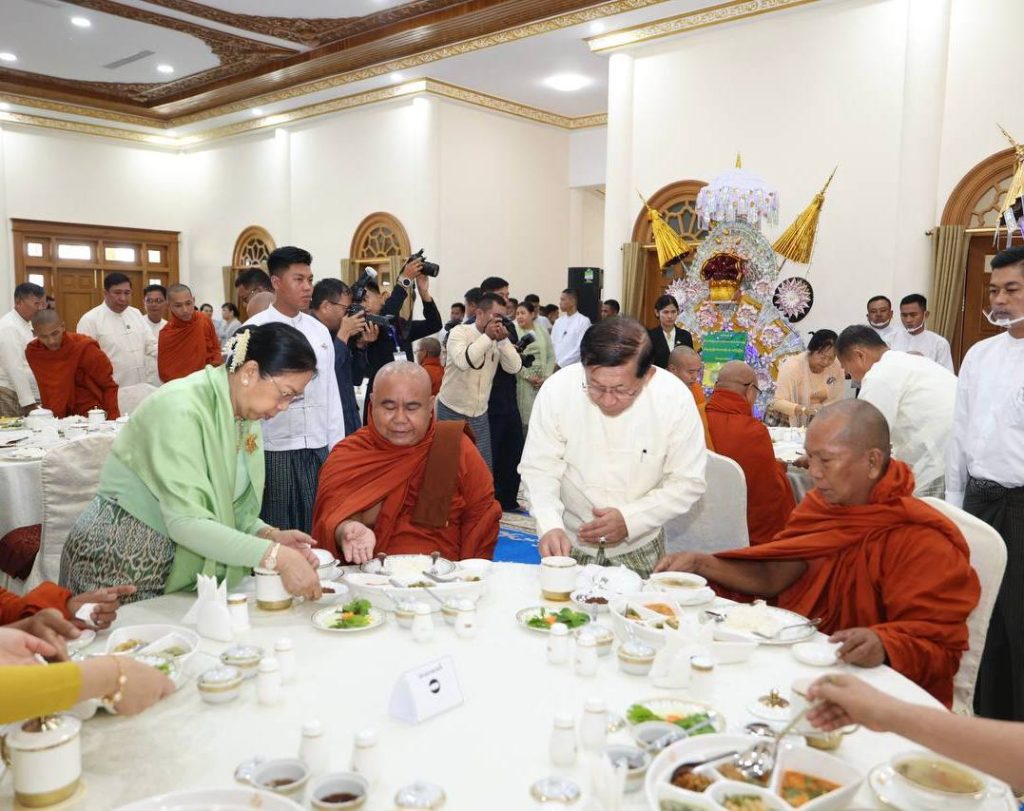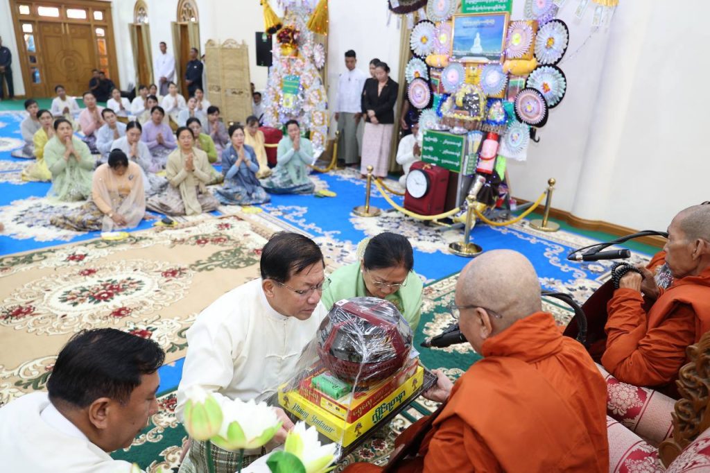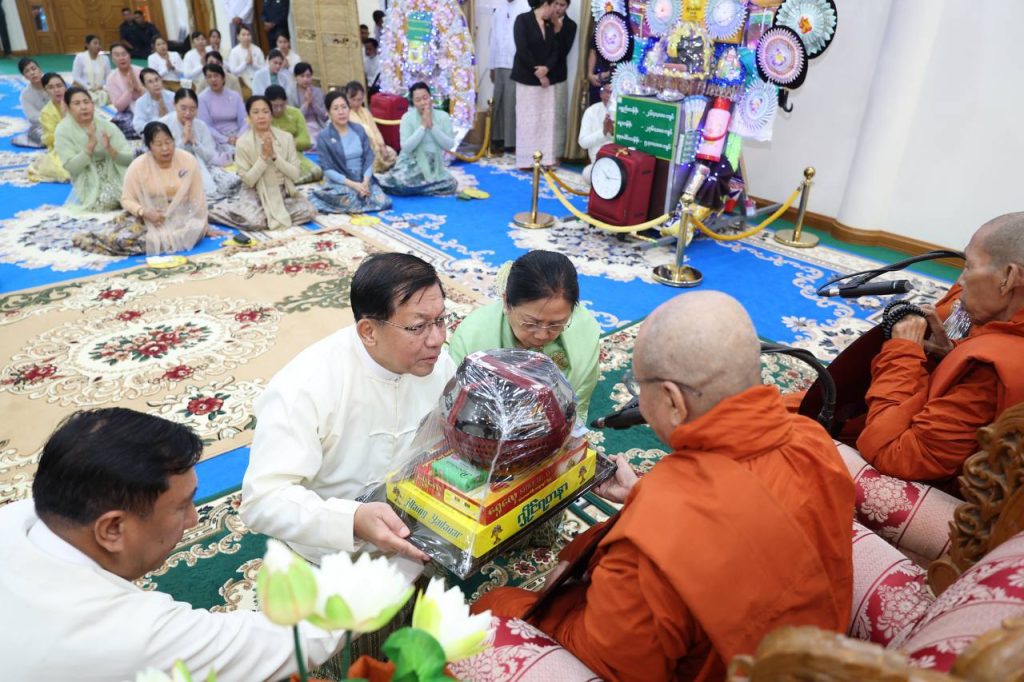 ထို့နောက် ယာယီသမ္မတနှင့် ဇနီးတို့သည် ကထိန်အလှူခံကျောင်း မာရဝိဇယကျောင်းတော် ကျောင်းထိုင်ဆရာတော် အဂ္ဂမဟာပဏ္ဍိတ အဂ္ဂမဟာသဒ္ဓမဇောတိကဓဇ ဘဒ္ဒန္တနေမိန္ဒထံ ကထိန်လျာသင်္ကန်းနှင့် လှူဖွယ်ပစ္စည်းများကို ဆက်ကပ်လှူဒါန်းသည်။